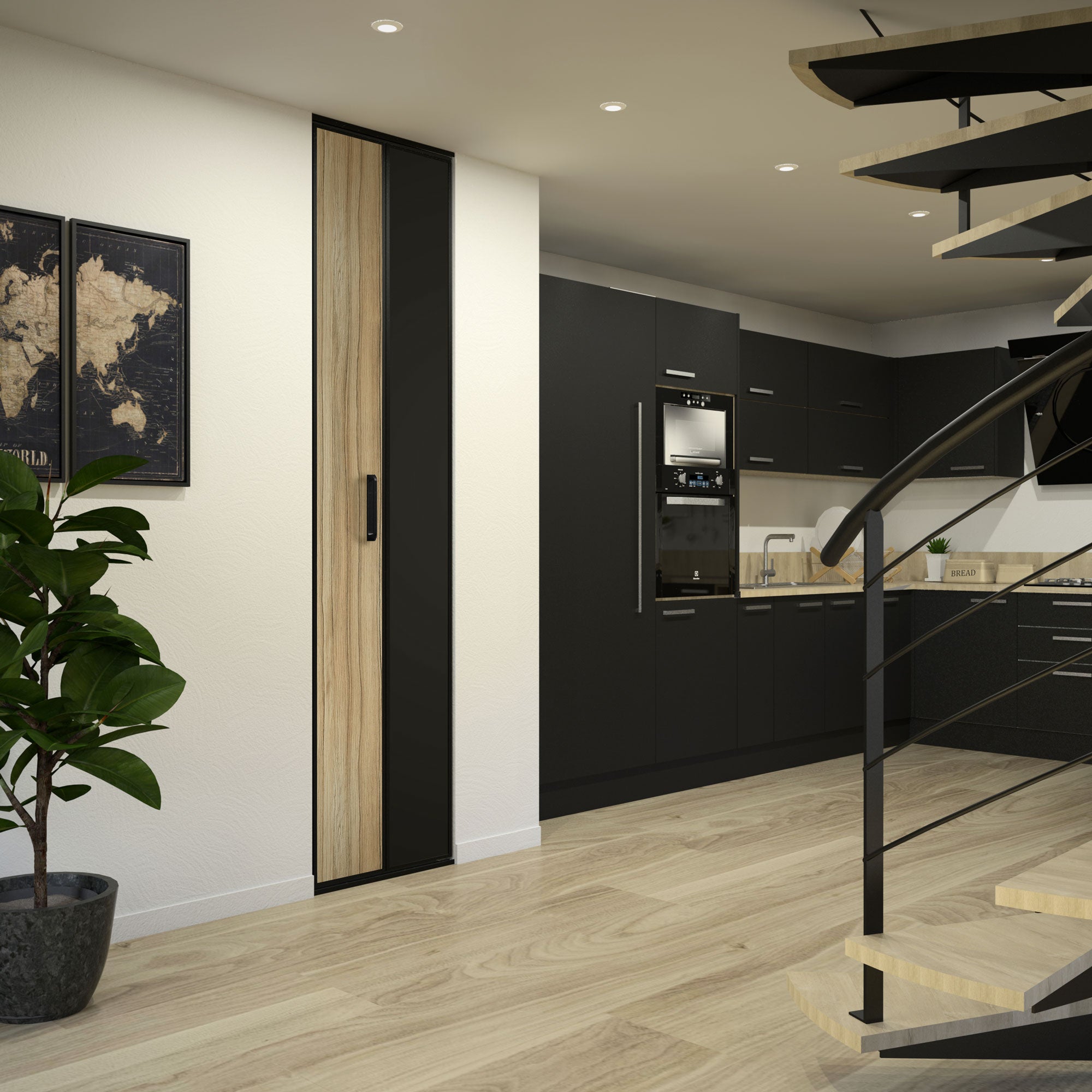 Composée d’une porte pliante au décor Noir intense et en bois Panama, cette façade, aux finitions assorties, conjuguera authenticité et volupté. Ses poignées en alu apportent une touche d’élégance à votre placard.