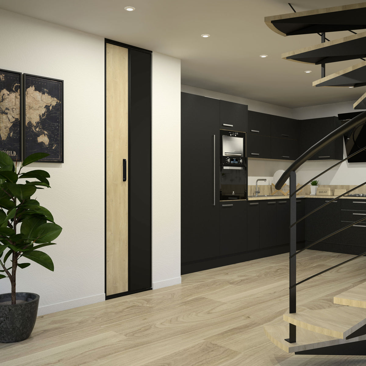 Cette collection élégante mise sur l’association de la profondeur du Noir intense à l'authenticité du Chêne Blond. Les finitions en bois assorties à la porte pliante et la poignée en alu naturel constituent des détails raffinés.