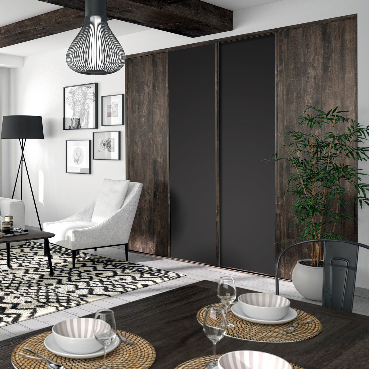 Osez l'originalité, jouez sur les contrastes ! Cette façade de placard est constituée d'une porte effet bois fumé brut, et d'une noir intense. Une finition en acier coordonnée au décor complète cet ensemble élégant et saisissant !