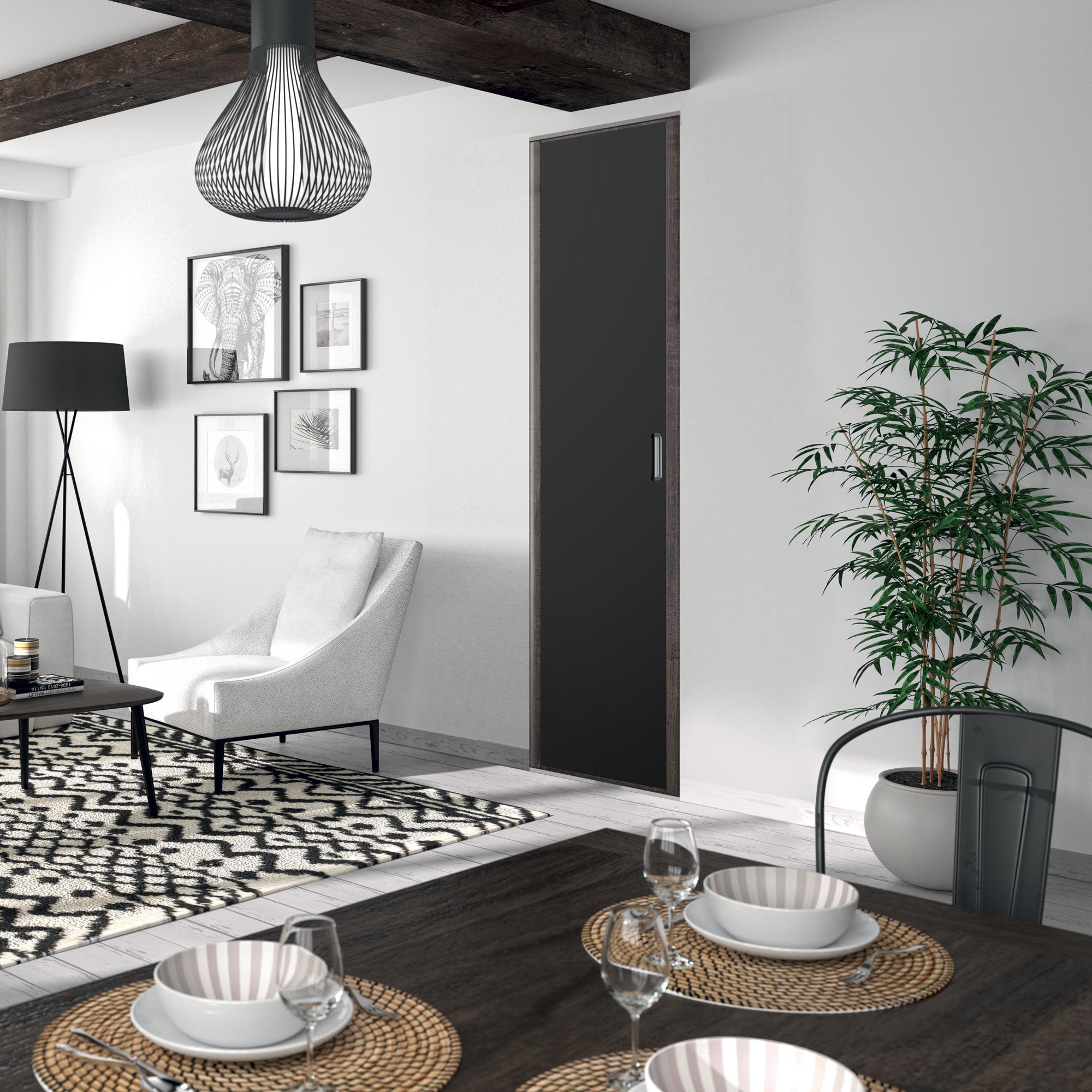 En optant pour cette porte de placard noir intense habillée d'une structure en acier effet bois fumé brut, faites le choix de créer une atmosphère puissante et sauvage et dans votre salon !