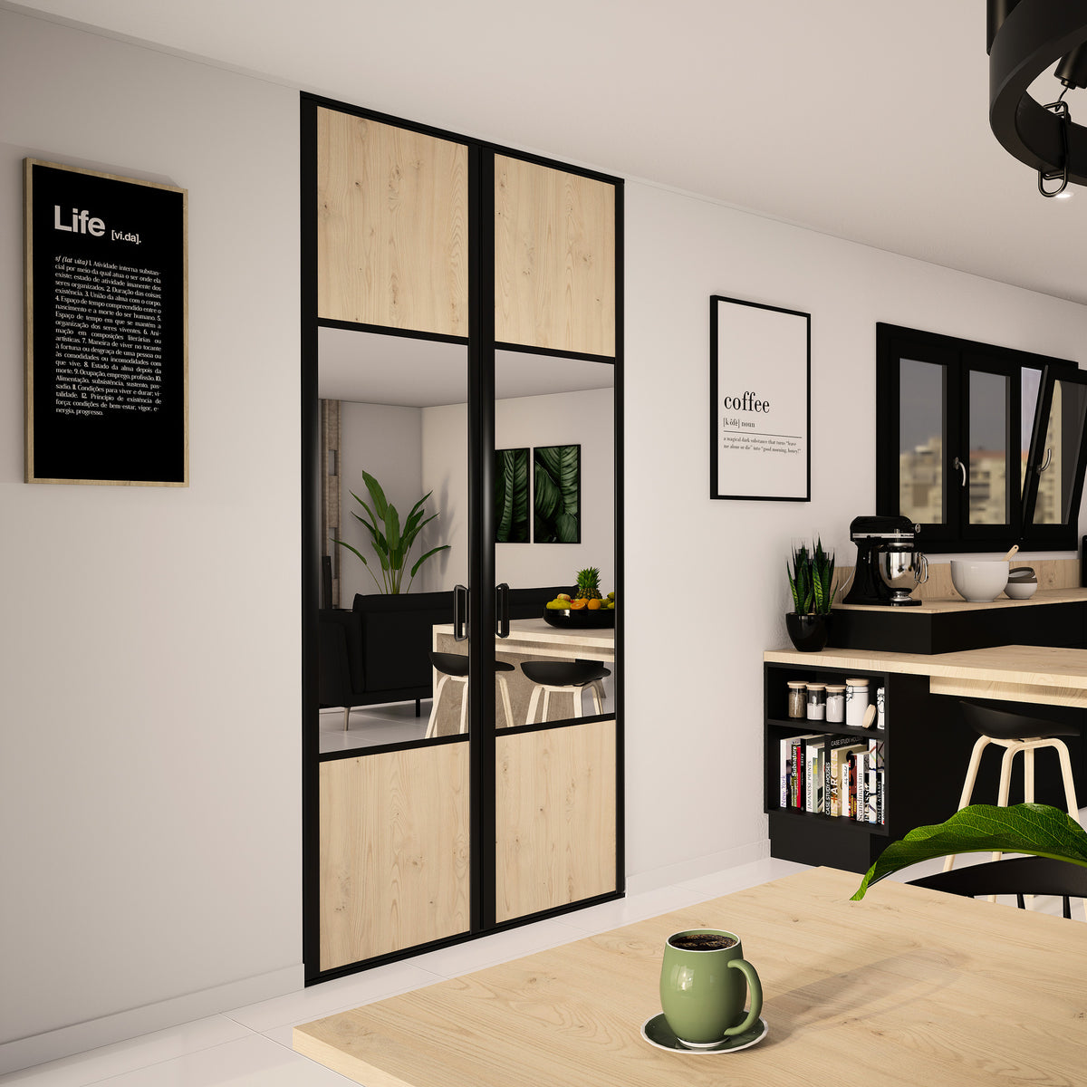 Succombez pour cette élégante façade de placard pivotante Kazed. Elle associe un lumineux miroir Argent et de chaleureux décors bois Châtaignier clair. Les traverses, profils et rails sont en Aluminium Noir mat. Une matière noble qui offre une finition particulièrement soignée et des lignes fines pour un rendu haut de gamme.
