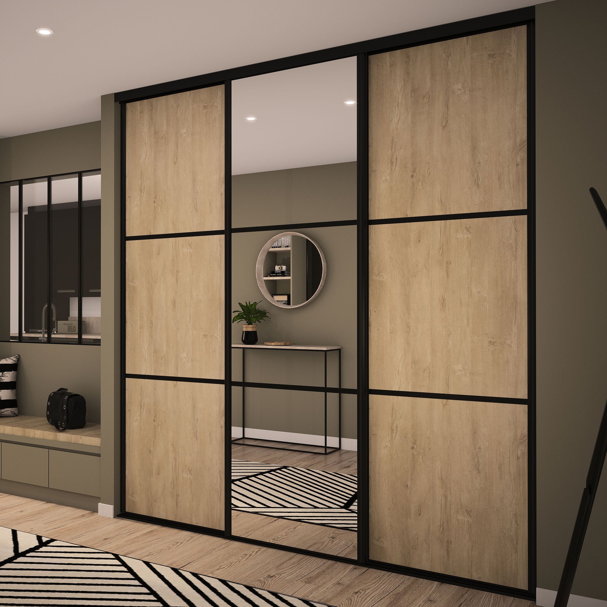 Esthétique et lumineuse, cette façade de placard coulissante donnera du caractère à votre pièce. La brillance du miroir argent est mixée à la douceur du décor Chêne blond. Les traverses et les finitions alu. Noir mat donnent un style industriel à l’ensemble.