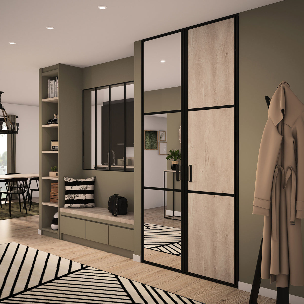 Modernité et naturel s’installe dans votre intérieur avec cette façade de placard pivotante ! Elle associe le design du noir, la modernité du miroir Argent et l’authenticité du décor Chêne flanelle brut.
