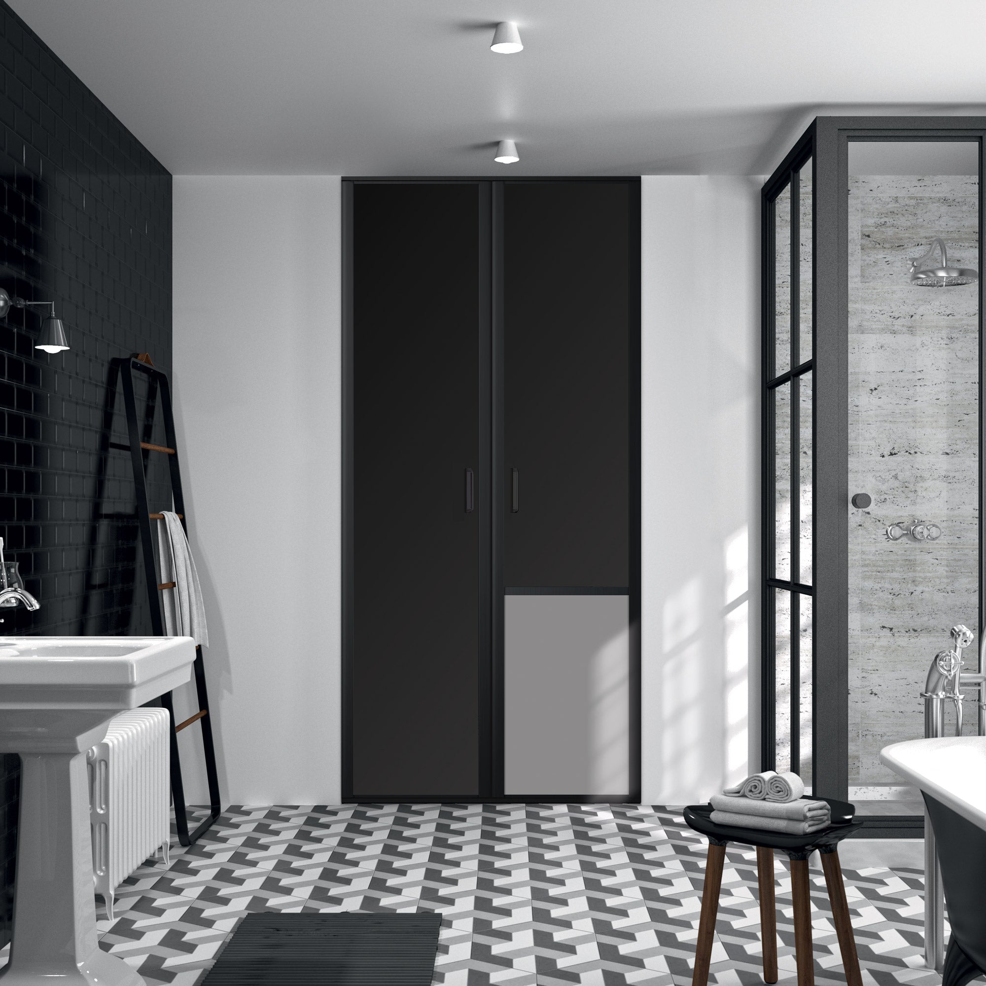 Ces portes de placard noir intense et gris intense, à la structure en aluminium noir mat, donneront un côté rock'n'roll à une pièce aux couleurs neutres.