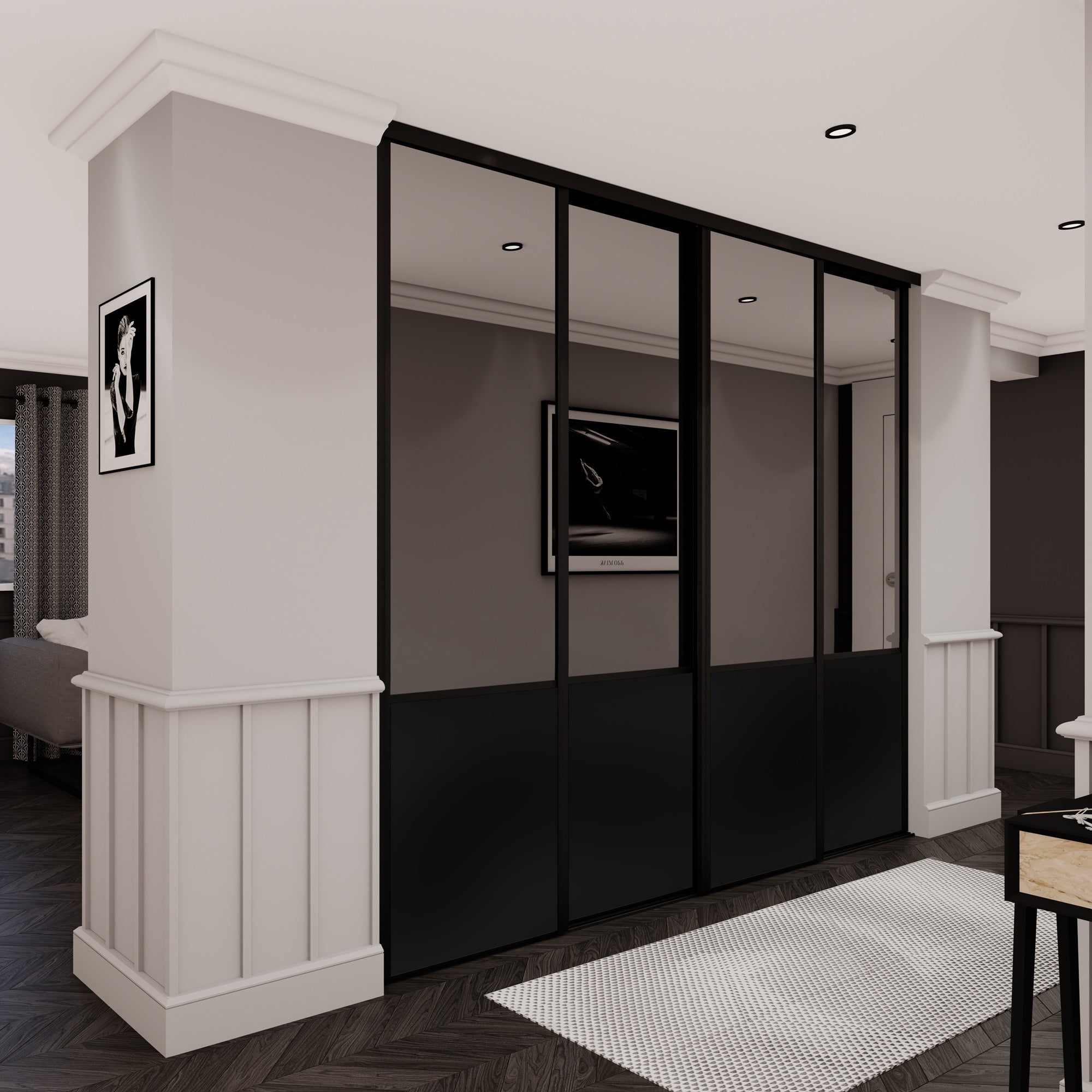 Succombez pour cette somptueuse façade de placard Kazed ! Le mix du lumineux miroir Plomb et du décor design Noir intense est sublimé par des finitions en aluminium noir mat.