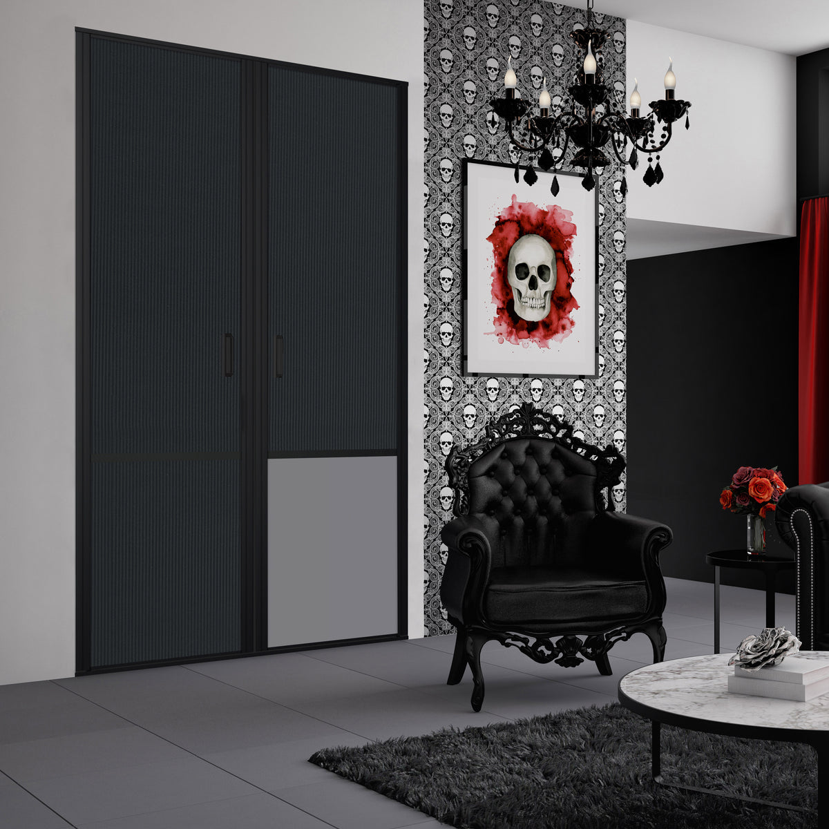 Vous tomberez sous le charme de cette façade de placard ! Le gris intense ajoute une touche de subtilité à votre déco et fait ressortir l'effet cuir carbone. La structure en aluminium noir mat achève de le mettre en valeur.