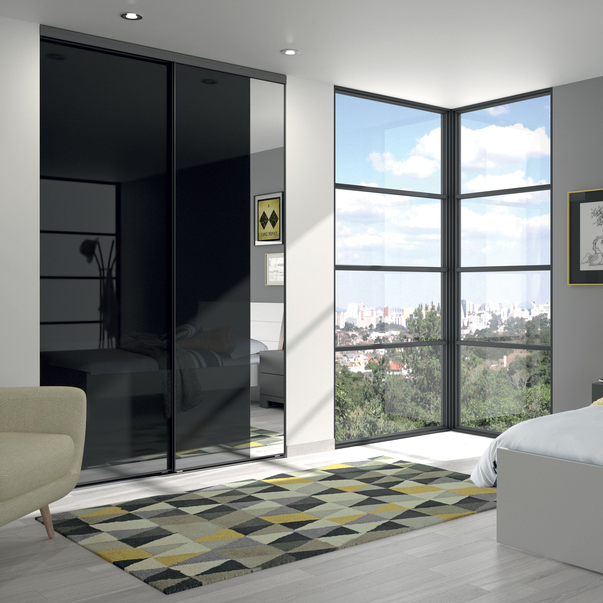 Avec son verre laqué noir et son miroir argent, cette façade de placard offre un design épuré par l'absence de traverses entre les deux matières. Rajoutez à cela une structure en aluminium noir mat et voilà un rangement aux lignes pures et à l'esprit contemporain.