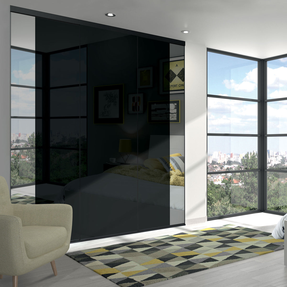 Cette façade de placard est élégamment habillée de verre laqué noir. Son miroir argent fera entrer la sérénité dans votre intérieur. L'ensemble est niché dans un écrin alu noir mat pour une architecture parfaite