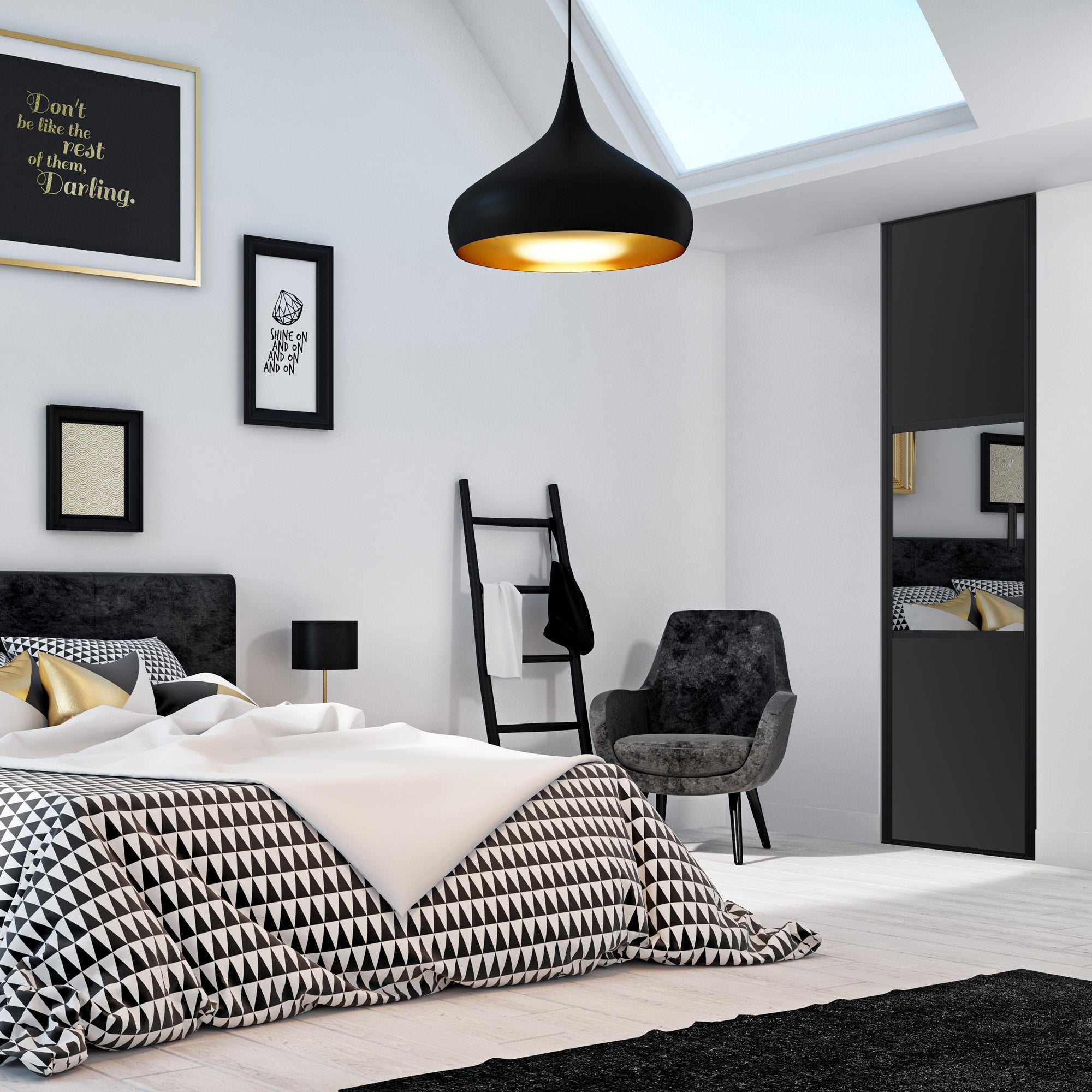 Offrez-vous une lecture horizontale avec ces miroirs placés au centre de portes au noir montées sur une structure en aluminium ! Cette façade de placard décuple la sensation de profondeur de la pièce.
