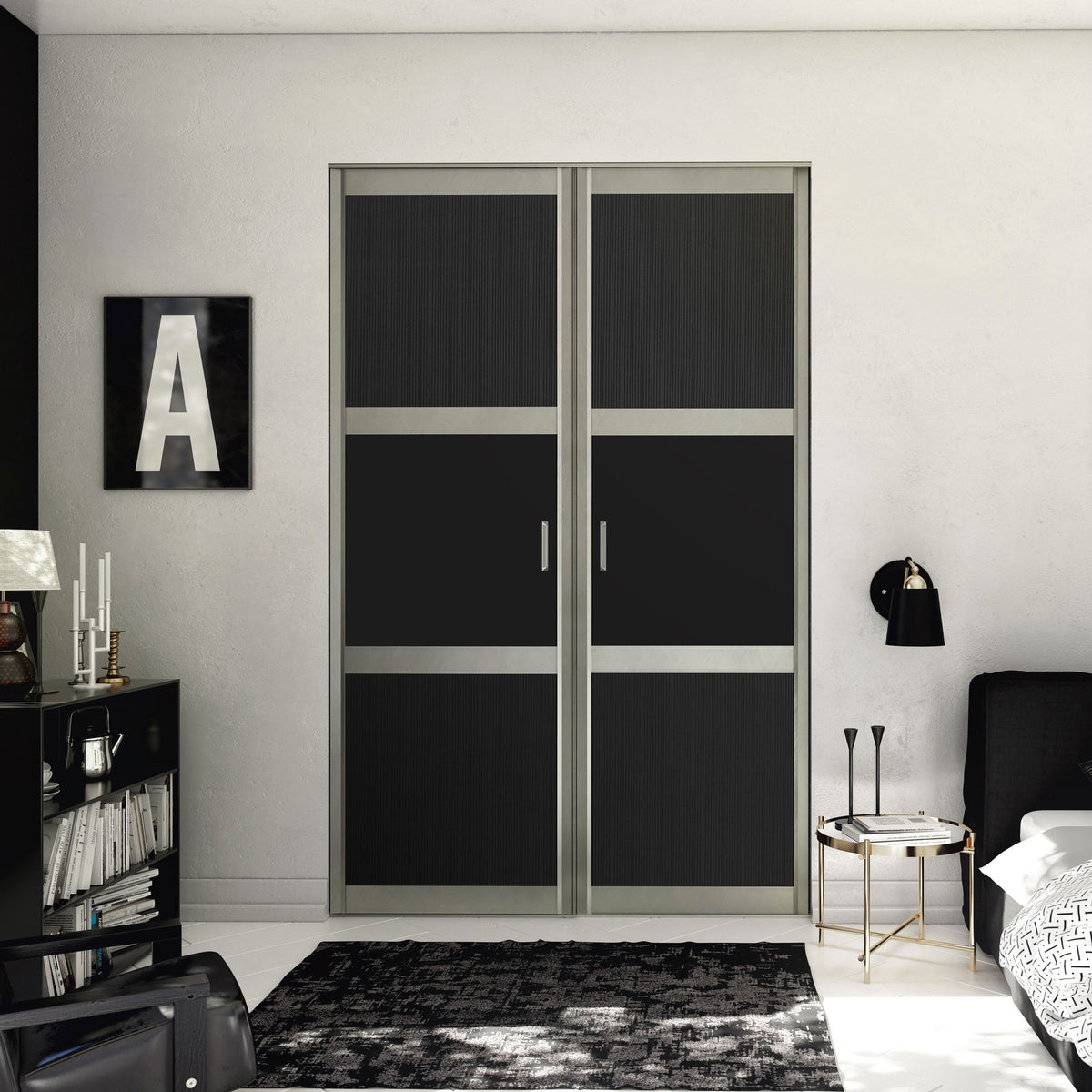 Adoptez l’effet damier monochrome de ces portes de placard pivotantes qui mixent les matières et jouent sur les nuances de noirs. Le décor Noir intense mat contraste avec le relief du cuir Carbone. La finition Effet inox brossé des traverses larges fait ressortir le noir de ces décors et les met en valeur.