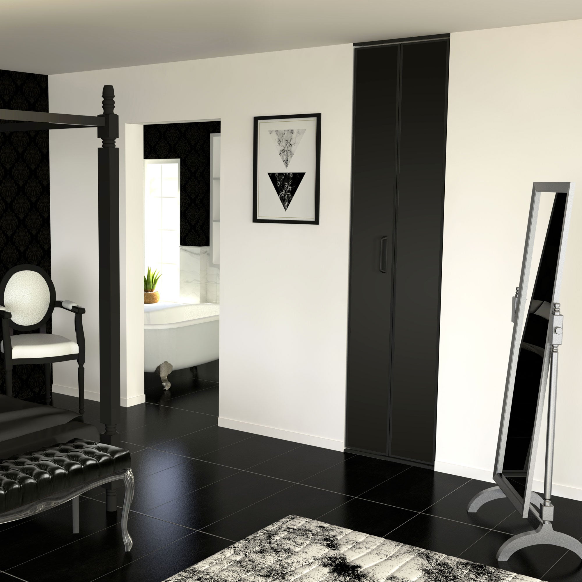 Pratique et peu encombrante, cette porte de placard pliante noir intense se fera très glamour dans la chambre à coucher. Pour une finition haut de gamme, la structure est en aluminium.