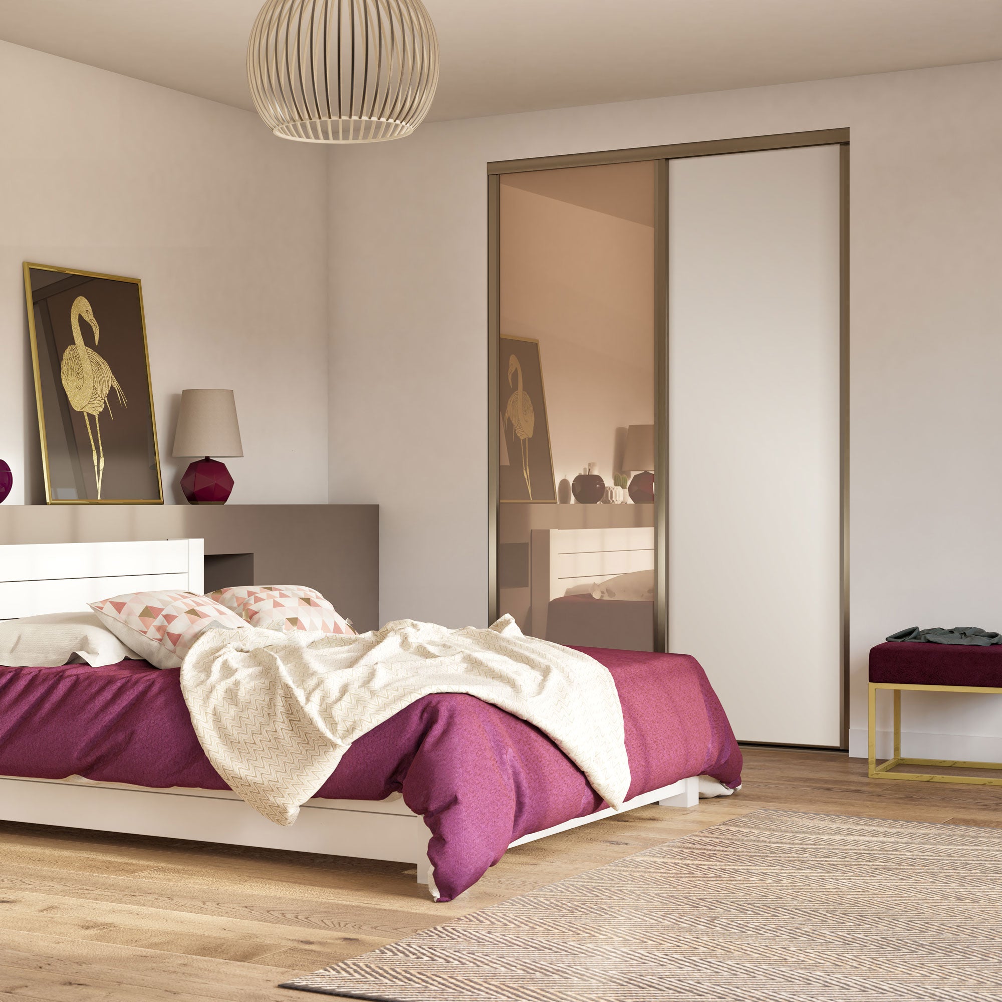 Idée tendance : mixez un miroir bronze à un lumineux ton blanc mat pour réchauffer l'atmosphère de votre pièce. L'aluminium inox brossé présent sur la structure et les finitions ajoutent une touche de chic à cette façade de placard.