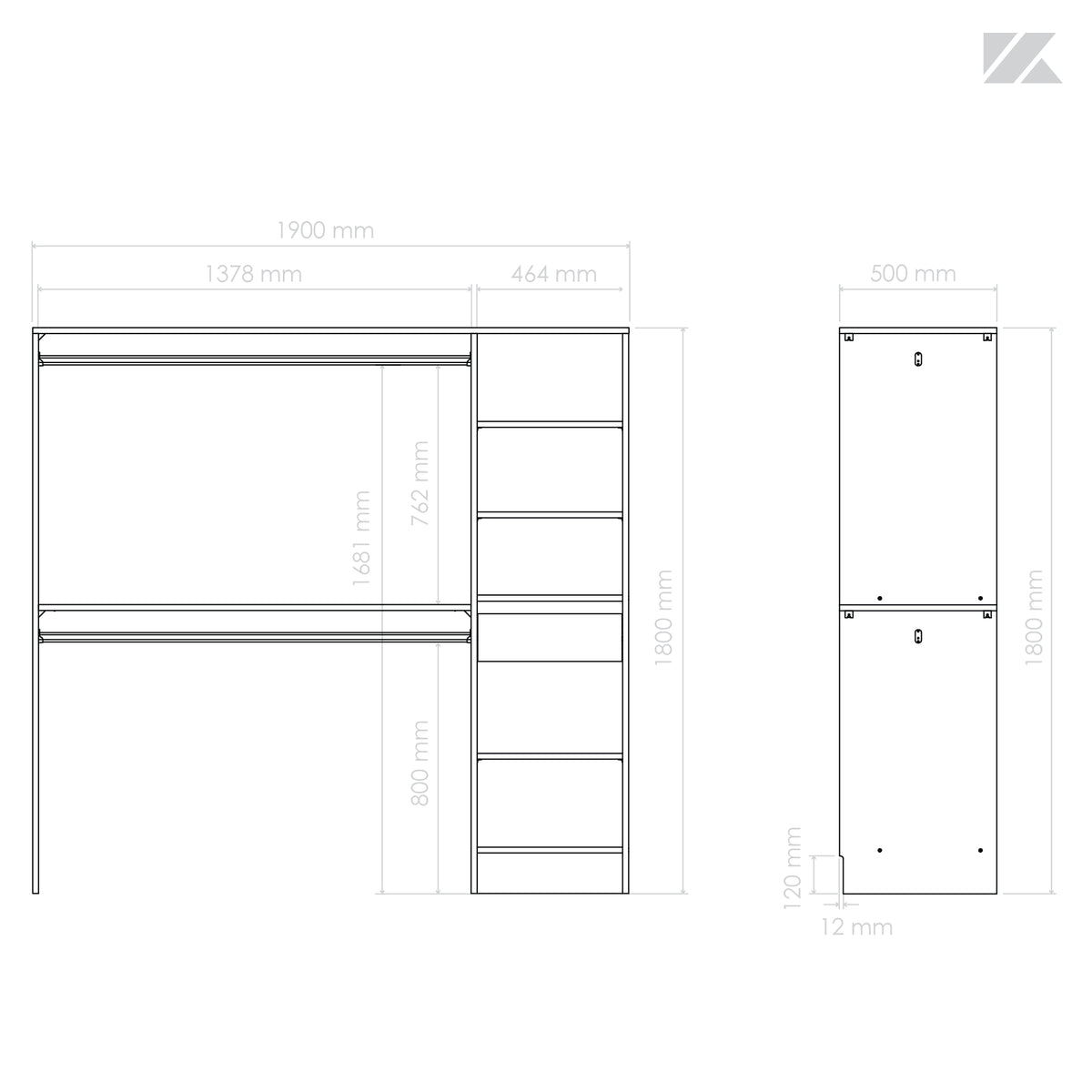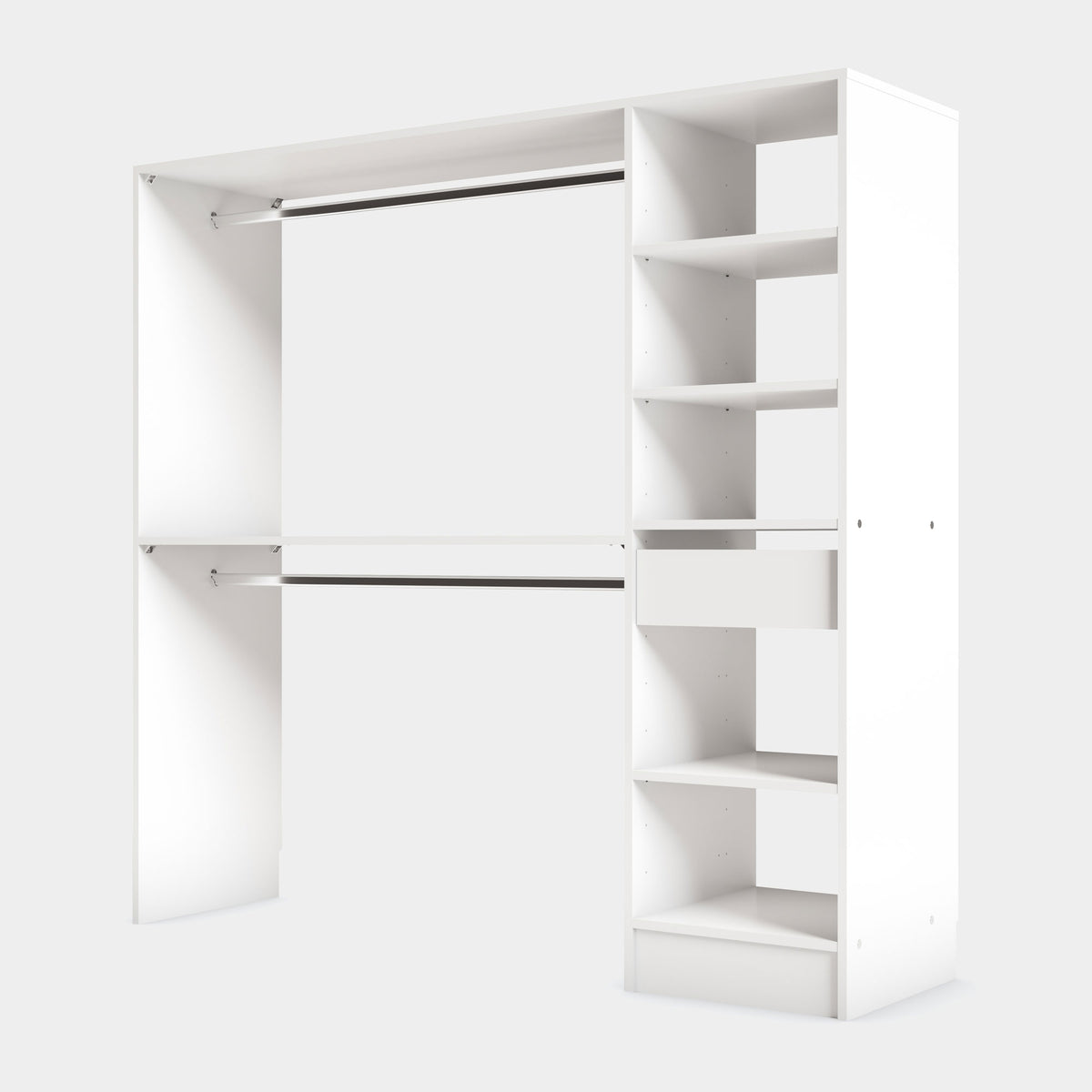 Ce dressing PRIMO autoportant est en mélaminé Blanc Mat. Ses 4 étagères, ses 2 tringles de penderie et son tiroir sont adaptés aux petits espaces et vous permettront de ranger l'ensemble de vos affaires.