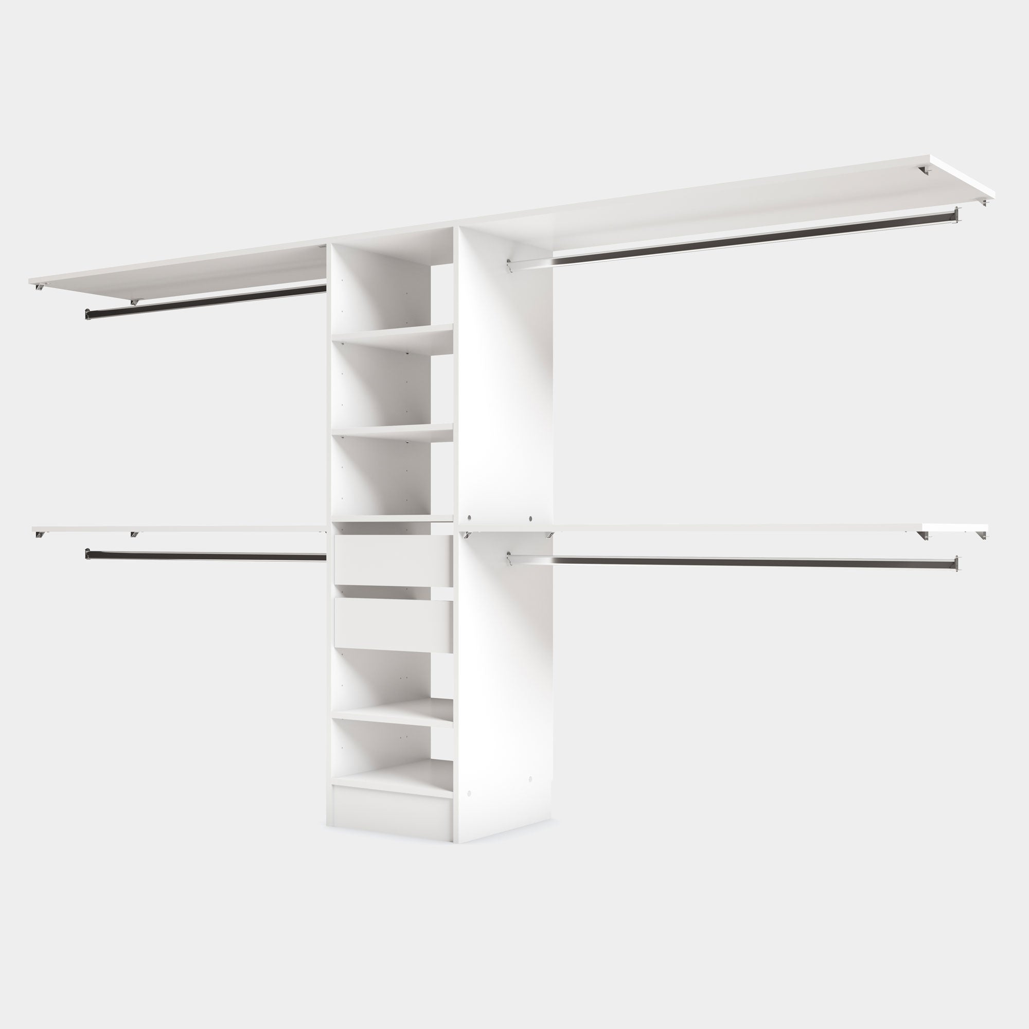 Ce dressing PRIMO est en mélaminé Blanc Mat. Ses 4 espaces de penderies, son caisson de 4 étagères et ses 2 tiroirs en font un rangement idéal pour les grands espaces.