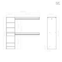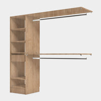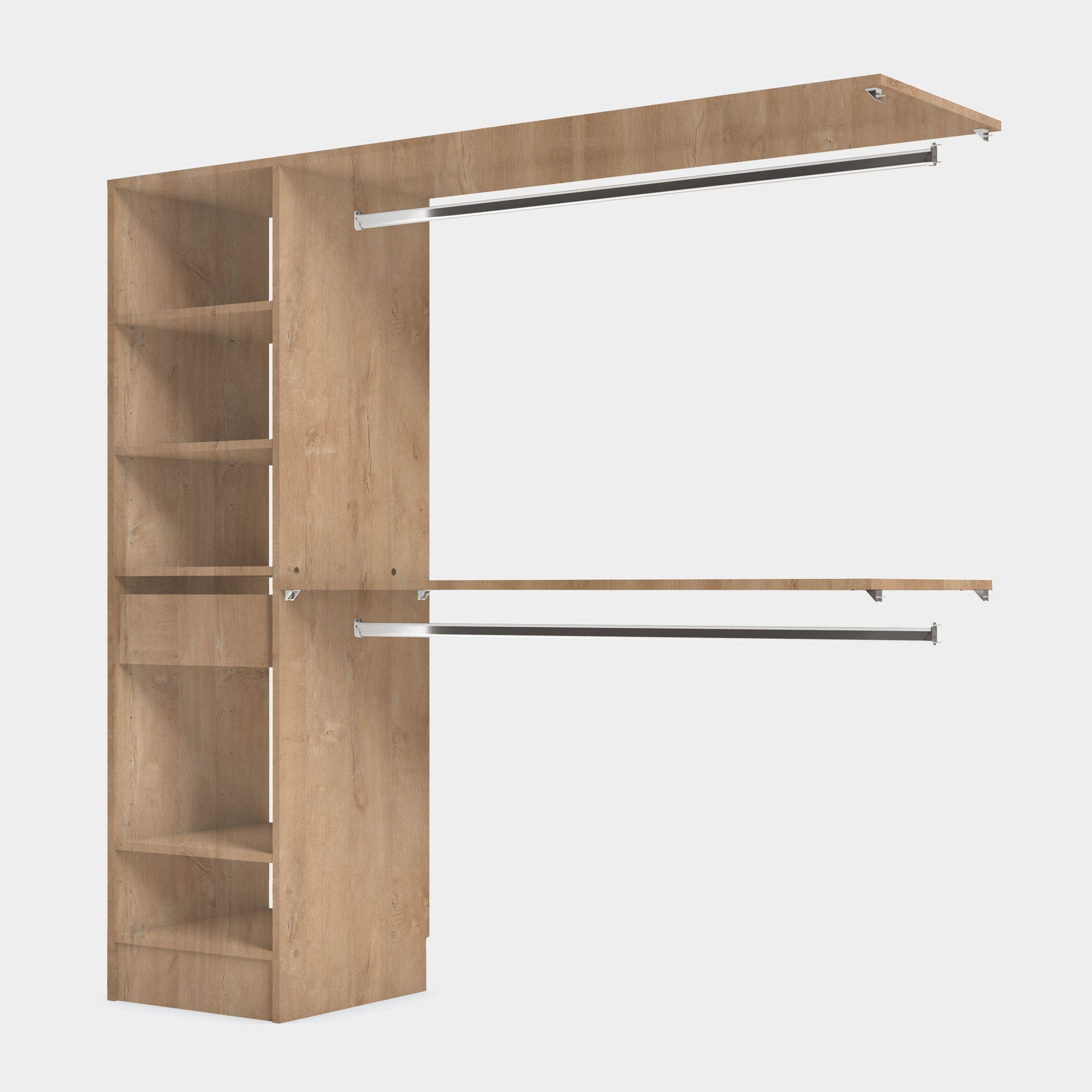 Ce dressing PRIMO est en mélaminé Chêne Blond. Ses 4 étagères, ses 2 tringles de penderie et son tiroir sont adaptés aux petits espaces et vous permettront de ranger l'ensemble de vos affaires.