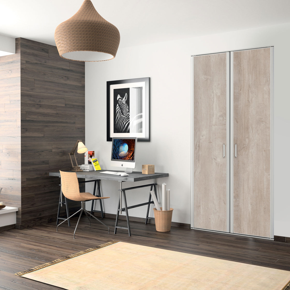 Adoptez ces portes de placard pivotantes effet chêne flanelle brut qui apporteront de la chaleur et de l'authenticité à votre intérieur. Les finitions et profils en acier laqué gris métal tranchent avec le décor afin de vous offrir un produit design et accueillant.