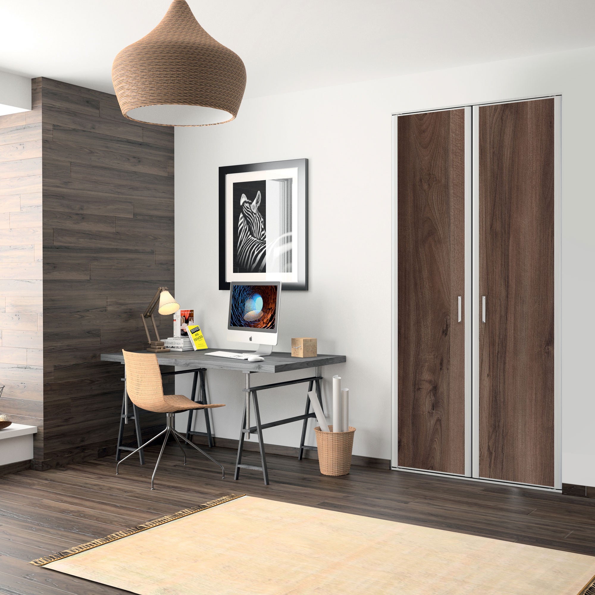 Adoptez ces portes de placard pivotantes effet noyer des andes qui apporteront de la chaleur et de l'authenticité à votre intérieur. Les finitions et profils en acier laqué gris métal tranchent avec le décor afin de vous offrir un produit design et accueillant.