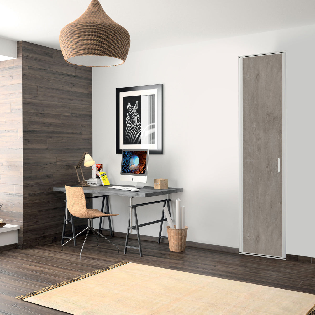 Adoptez ces portes de placard pivotantes effet chêne cigare brut qui apporteront de la chaleur et de l'authenticité à votre intérieur. Les finitions et profils en acier laqué gris métal tranchent avec le décor afin de vous offrir un produit design et accueillant.