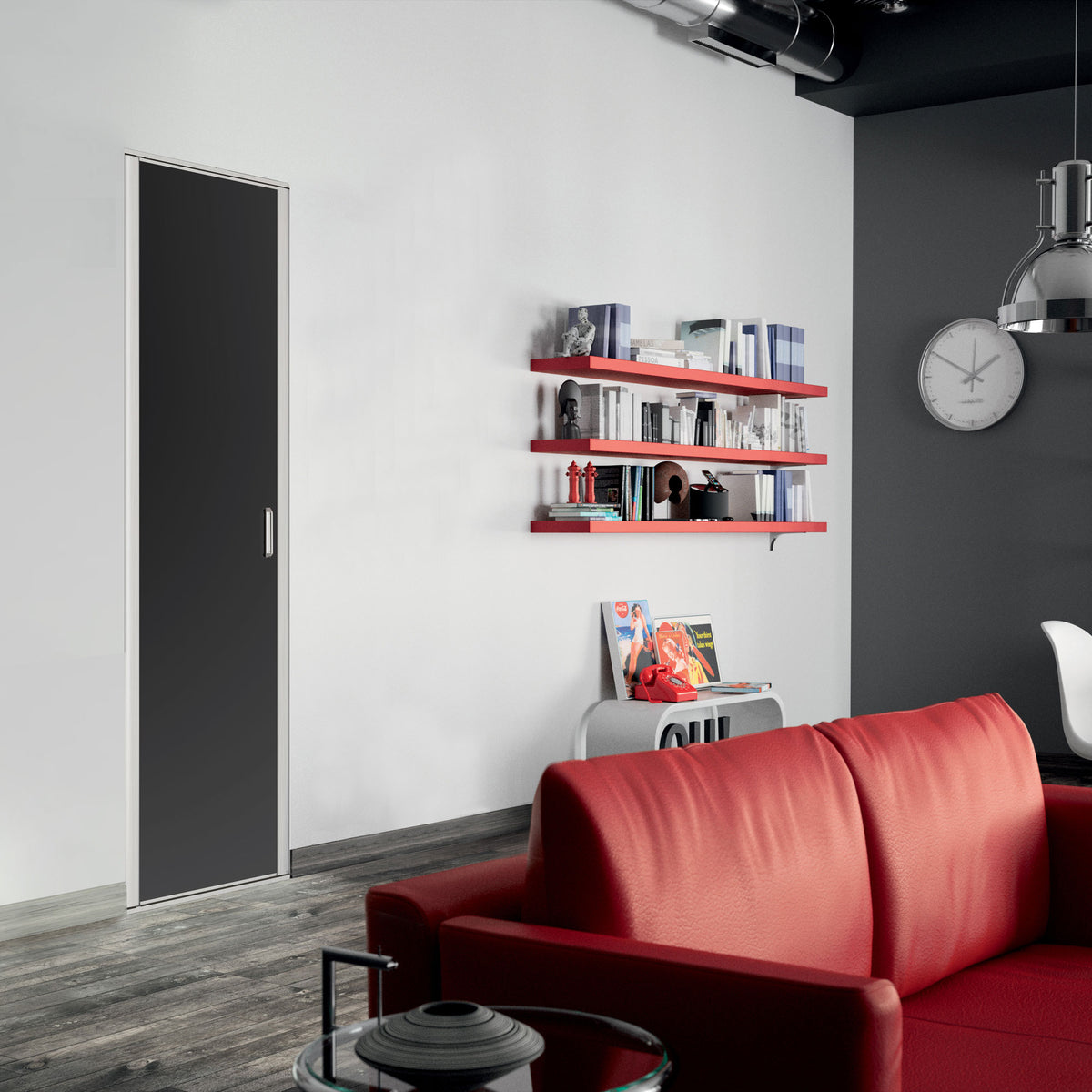 La subtilité du noir intense de cette façade de placard optimise la luminosité de votre pièce et modernise votre décoration. Sa structure en acier légèrement plus sombre la met parfaitement en valeur.