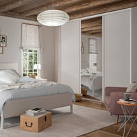 Simple et fonctionnelle, cette façade de placard est composée de deux portes effet frêne blanc et d'une porte supportant un miroir argent. Associée à une structure en acier,elle vous offrira une belle touche de luminosité et de sobriété.