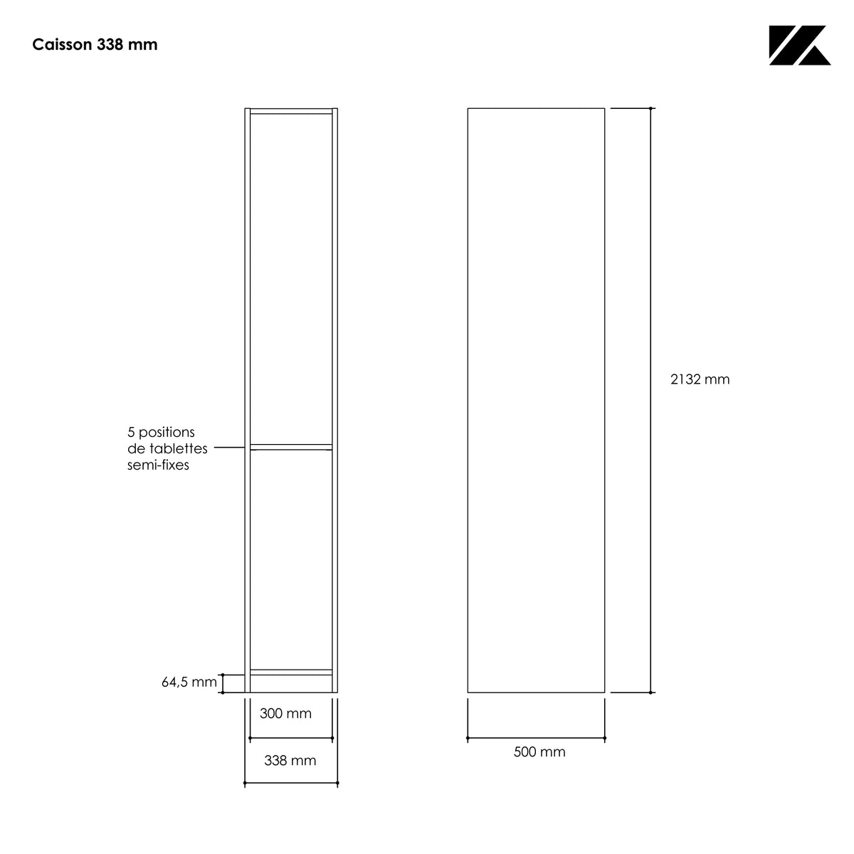Bon à savoir : Des vérins de réglages sous chaque caisson permettent de compenser les irrégularités du sol. Un jeu de vis de liaisons fourni avec chaque caisson assure un parfait alignement entre eux. Pour une finition mur à mur, Kazed vous propose un fileur, livré avec fixations et à recouper sur place.Dimensions hors tout du caisson : H2132 mm x L338 mm x P500 mm