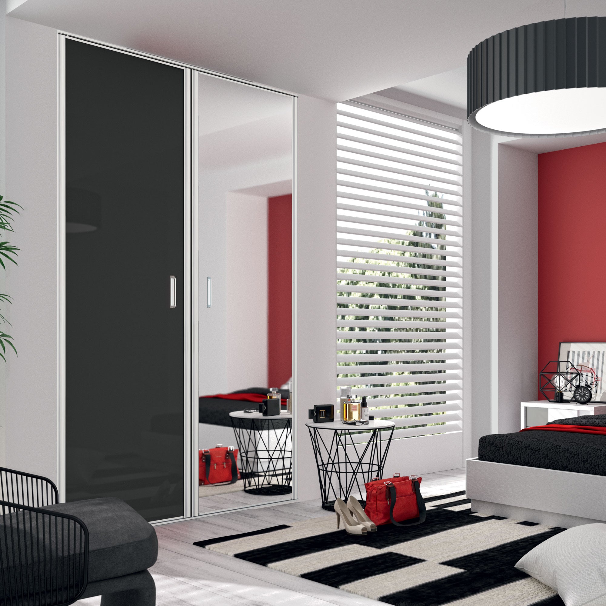 Optez pour une touche d'élégance ! Ce modèle de portes pivotantes apporte de la sérénité avec son verre laqué noir complété d'un miroir argent. Sa finition en acier lie parfaitement l'ensemble.