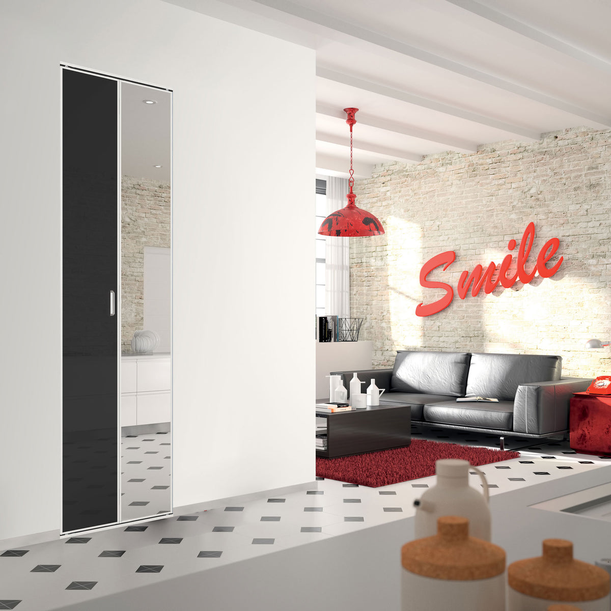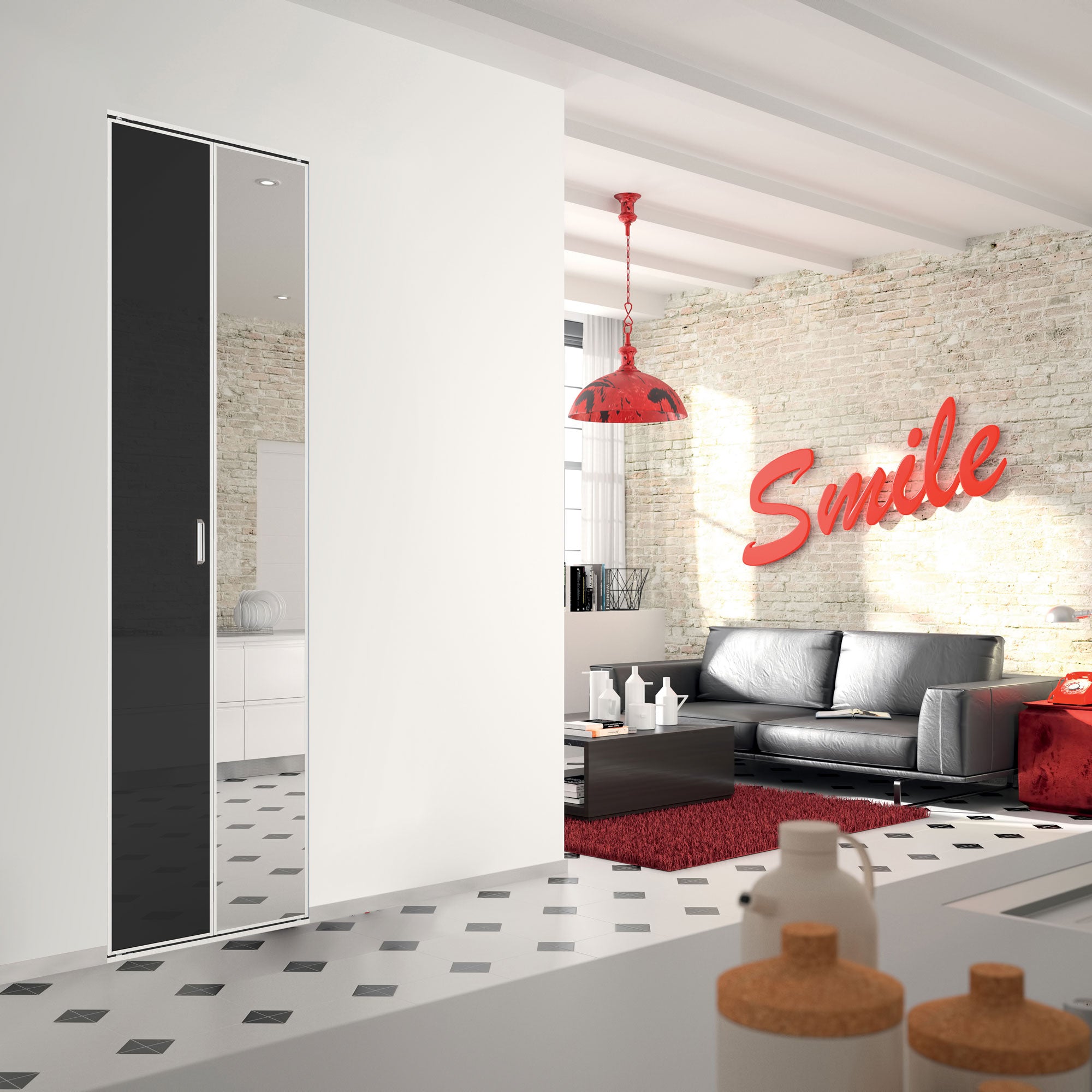 Un style rétro-moderne,une ambiance lumineuse, voilà ce qui ressort en observant cette porte de placard pivotante en verre laqué noir. Elle est sublimée par un miroir argent reposant sur une structure en aluminium.