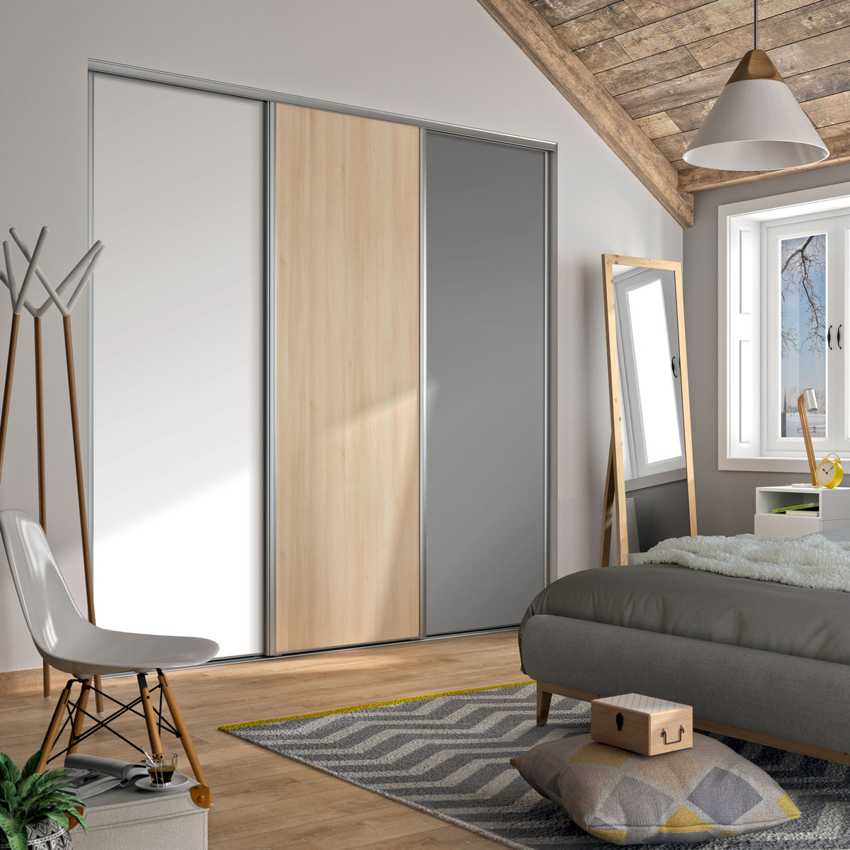 Apaisante et agréable, cette façade de placard trouvera facilement sa place dans votre chambre. Ses tons blanc mat, acacia clair et gris intense se complètent parfaitement et forment un ensemble chaleureux. Les finitions sont en acier laqué gris métal.