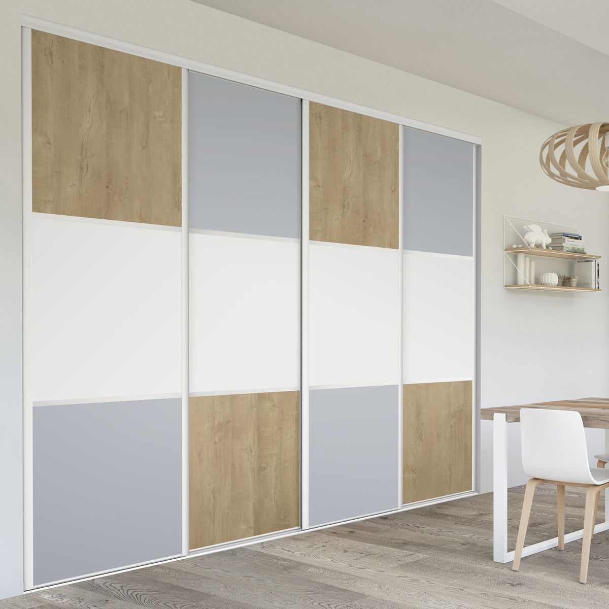 Cette porte de placard graphique sera idéale pour votre déco scandinave ! Les décors neutres Gris galet et Blanc mat sont associés à un chaleureux Chêne blond. Ces portes de placard coulissantes sont habillées d´aluminium Blanc mat qui sublime cette composition.