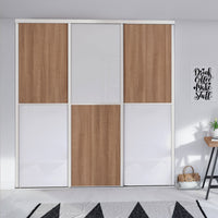 La Collection Oslo offre une atmosphère scandinave graphique et moderne grâce à sa composition en damier. La structure en aluminium blanc mat habille remarquablement bien les portes au décor merisier romana et en verre laqué blanc pur.