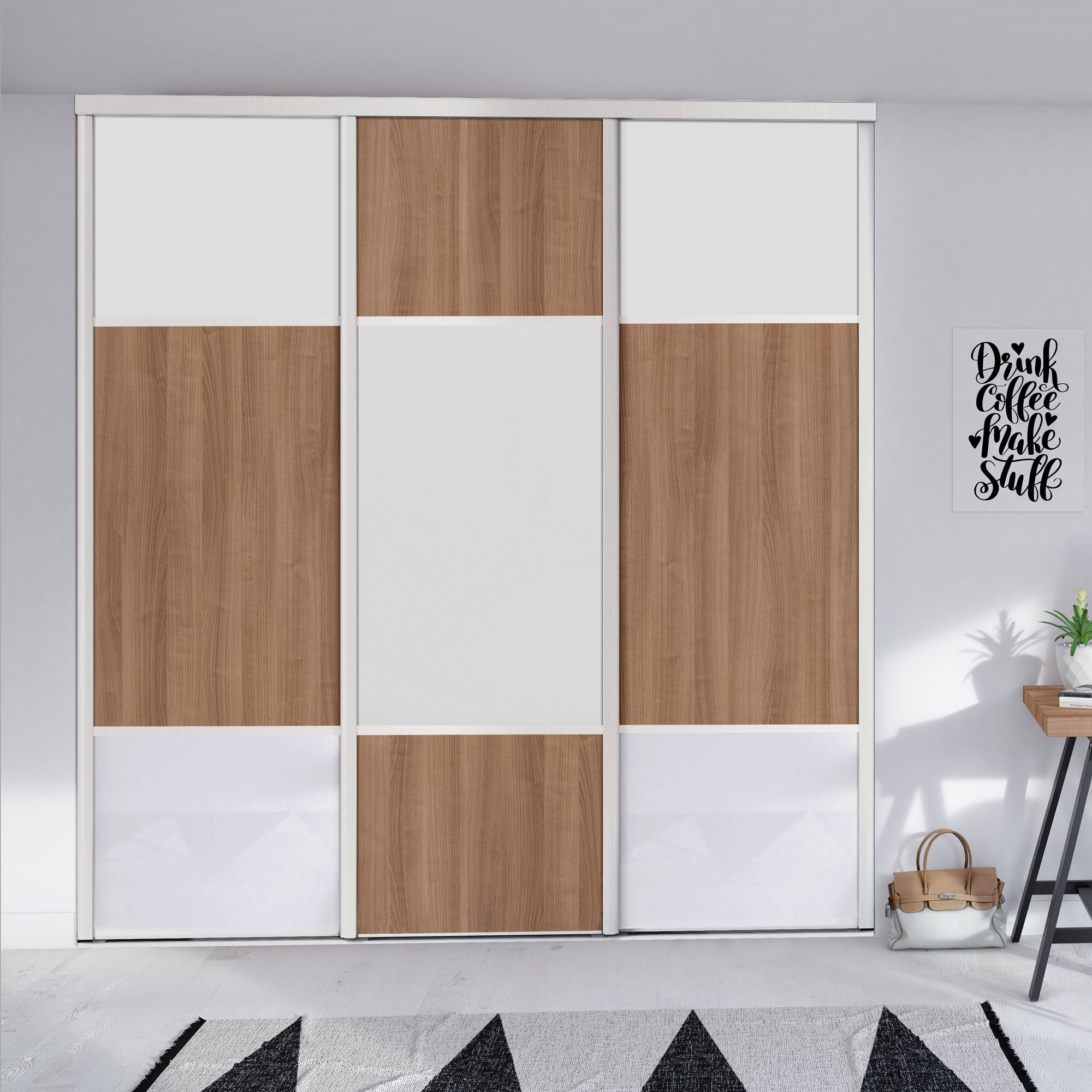La Collection Oslo offre une atmosphère scandinave graphique et moderne grâce à sa composition en damier. La structure en aluminium blanc mat habille remarquablement bien les portes au décor merisier romana et en verre laqué blanc pur.