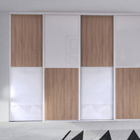 Le style en ligne de cette porte de placard est classe et élégant. La structure en aluminium blanc mat habille remarquablement bien les portes au décor merisier romana et en verre laqué blanc pur.
