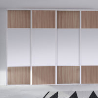 Installez une atmosphère nordique graphique et moderne avec ce placard aux décors merisier romana et blanc mat. La structure en aluminium blanc mat dynamise la composition en damier des panneaux.