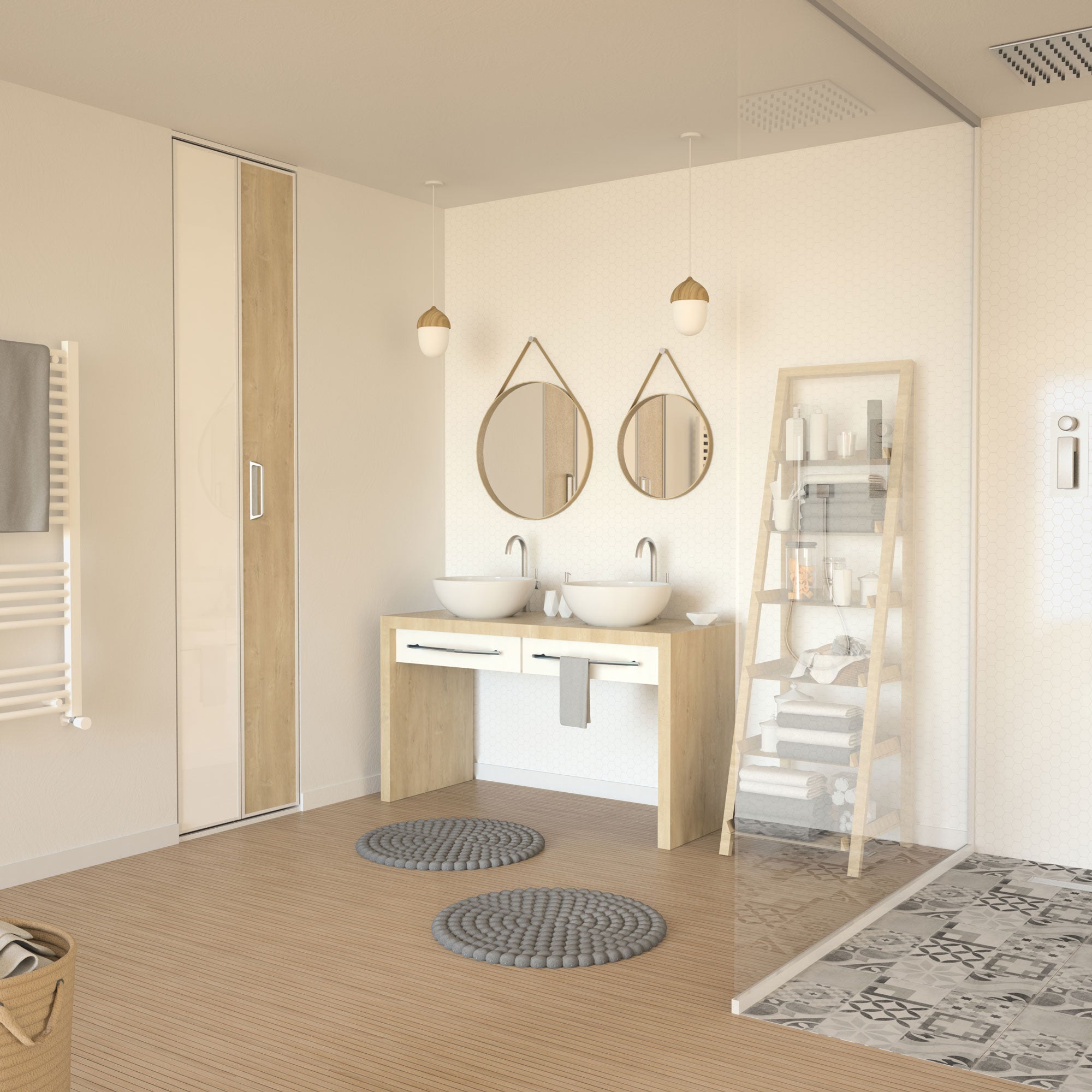 L’éblouissant verre laqué blanc pur de cette porte de placard pliante met en valeur son décor effet chêne blond. Particulièrement soignée et élégante, la finition est en aluminium blanc mat.