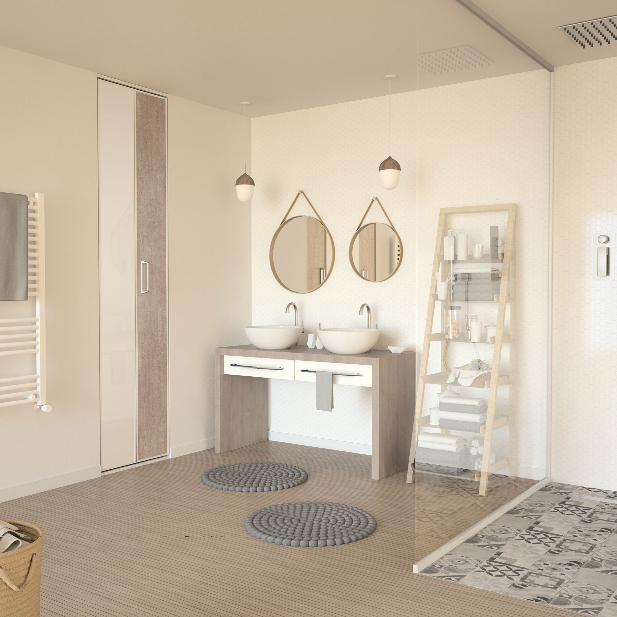 L’effet chêne flanelle brut marié au verre laqué blanc pur offre un rendu rafraichissant à cette porte de placard pliante. L’ensemble est finalisé par une élégante structure en aluminium blanc mat.