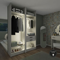 Ce dressing Zebrano Blanc de 2 espaces est composé de deux tringles (1 penderie longue pour les robes et manteaux et 1 penderie courte pour les vêtements de type chemises, vestes), de 4 étagères de rangement (idéales pour les vêtements pliés, comme les t-shirts et les pulls), et de deux tiroirs simples (pour accueillir les accessoires et les ceintures).
