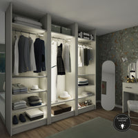 Les points forts : Fabriqué à vos dimensions. Epaisseur de la structure 22 mm, fond de 8 mm monté en rainure pour une rigidité parfaite. Des pieds de réglages permettent le bon ajustement de votre dressing. Konsilio est parfaitement adapté à une installation avec ou sans portes de placard Kazed.