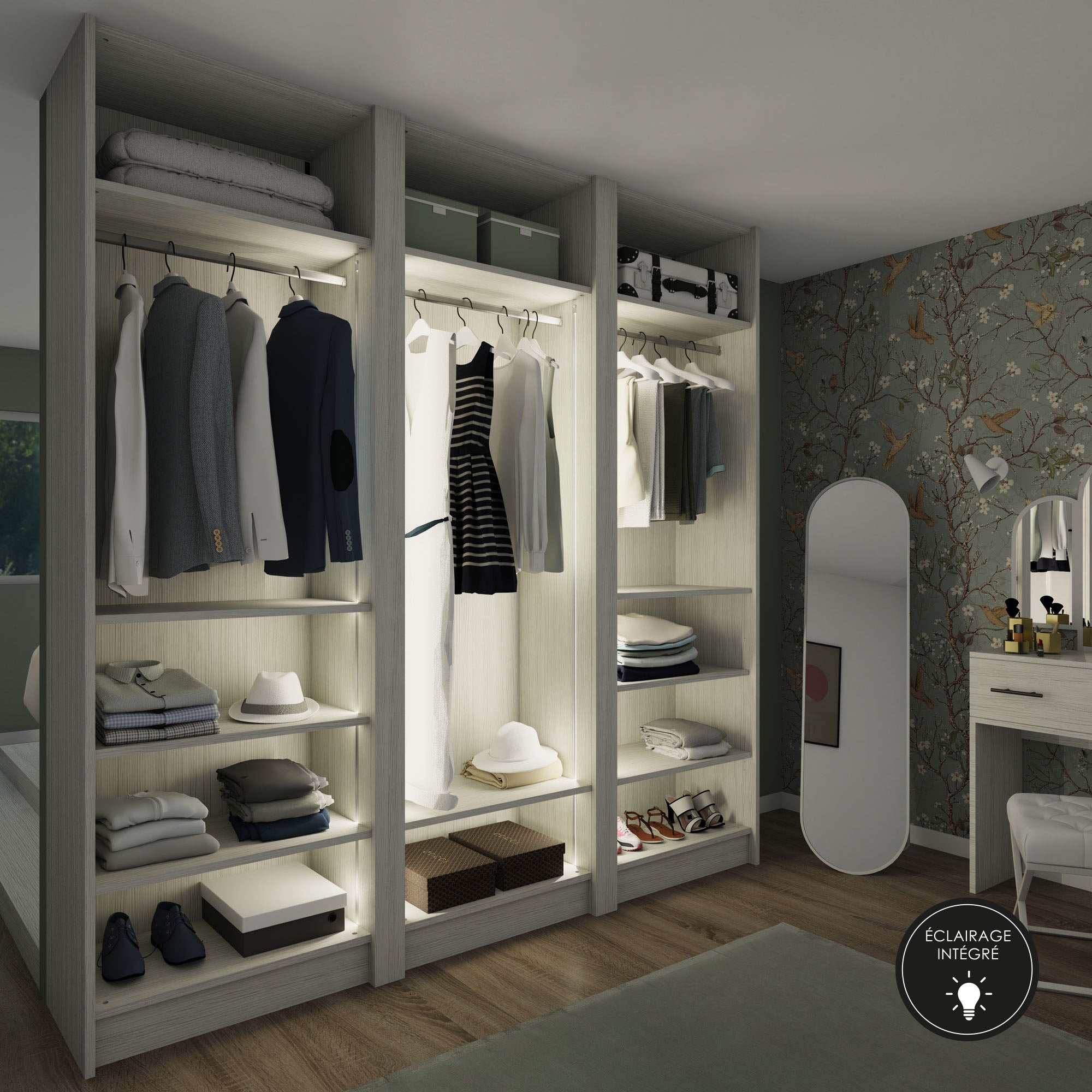 Personnalisable à vos mesures, le dressing Soleo présente l’immense avantage d’être éclairé. Une lumière chaude et agréable éclaire parfaitement le contenu de votre rangement sans vous éblouir.