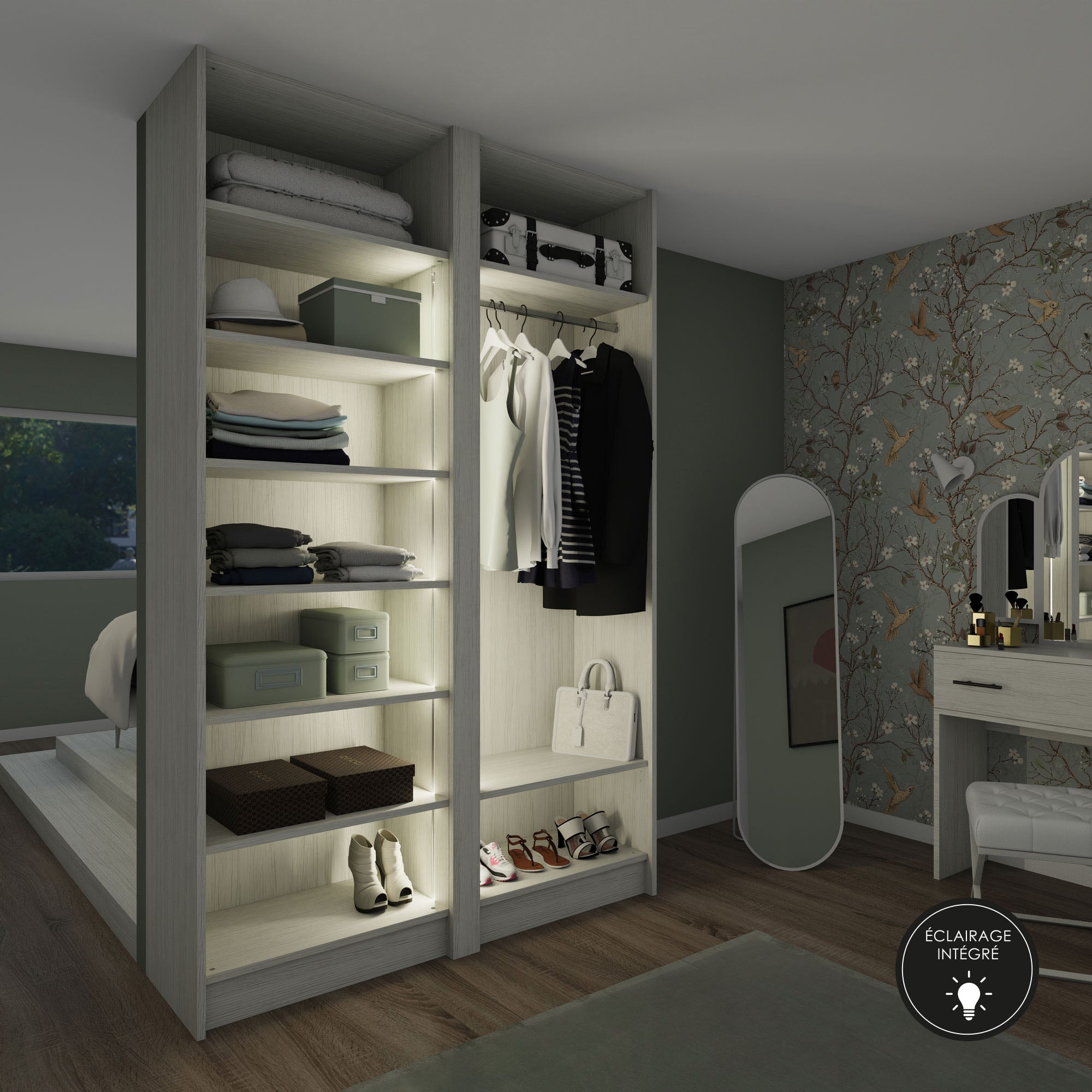 Personnalisable à vos mesures, le dressing Soleo présente l’immense avantage d’être éclairé. Une lumière chaude et agréable éclaire parfaitement le contenu de votre rangement sans vous éblouir.