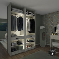 Les points forts : Fabriqué à vos dimensions. Epaisseur de la structure 22 mm, fond de 8 mm monté en rainure pour une rigidité parfaite. Des pieds de réglages permettent le bon ajustement de votre dressing. Konsilio est parfaitement adapté à une installation avec ou sans portes de placard Kazed.