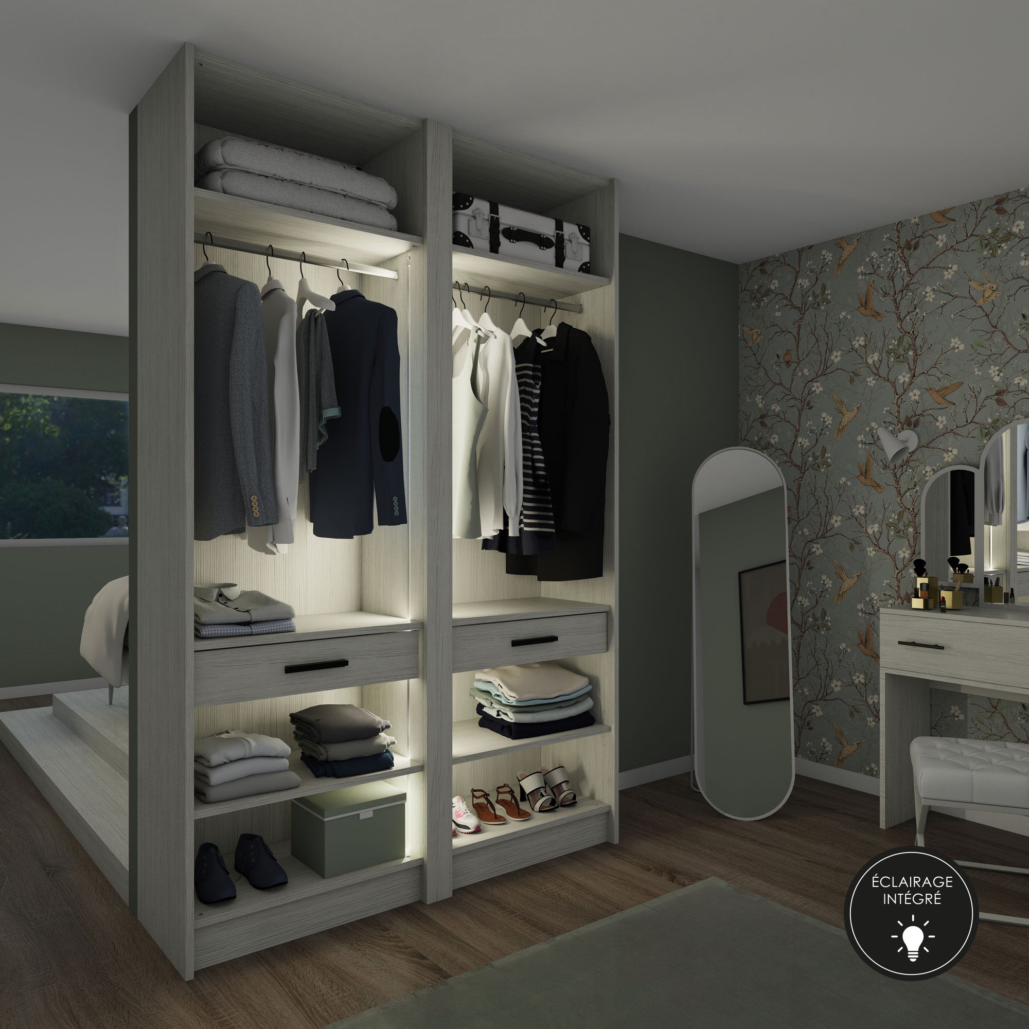 Personnalisable à vos mesures, le dressing Soleo présente l’immense avantage d’être éclairé. Une lumière chaude et agréable éclaire parfaitement le contenu de votre rangement sans vous éblouir.