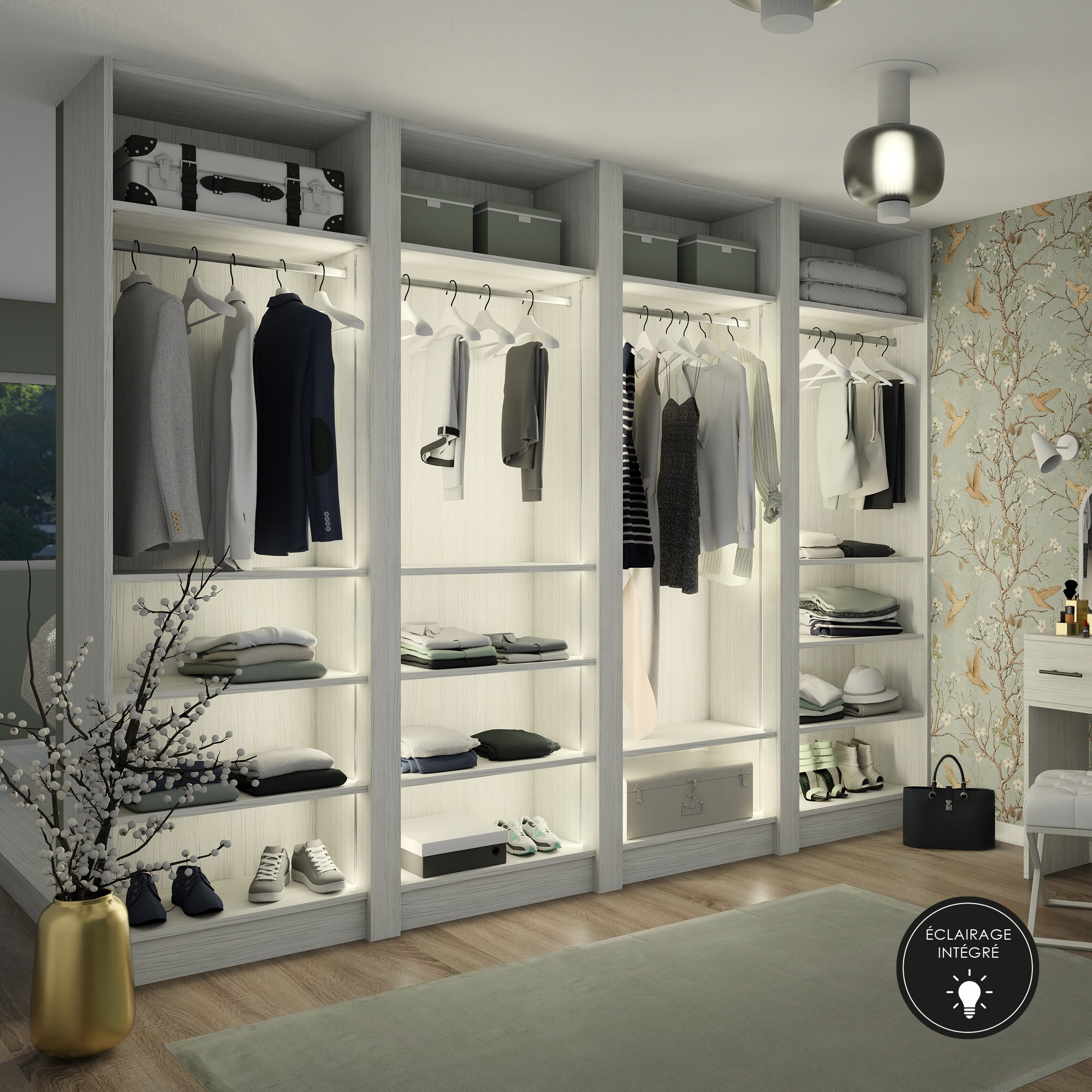 Personnalisable à vos mesures, le dressing Soleo présente l’immense avantage d’être éclairé. Une lumière chaude et agréable éclaire parfaitement le contenu de votre rangement sans vous éblouir.