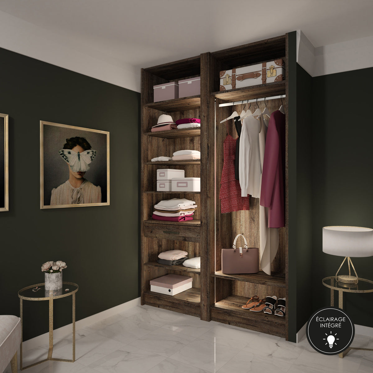 Ce dressing Authentique Brun de 2 espaces est composé d'une tringle (1 penderie longue pour les robes et manteaux), de 8 étagères de rangement (idéales pour les vêtements pliés, comme les t-shirts et les pulls), et d'un tiroir simple (pour accueillir les accessoires et les ceintures).