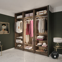 Ce dressing Authentique Brun de 3 espaces est composé de trois tringles (1 penderie longue pour les robes et manteaux et 2 penderies courtes pour les vêtements de type chemises, vestes) et de 10 étagères de rangement (idéales pour les vêtements pliés, comme les t-shirts et les pulls).