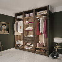 Ce dressing Authentique Brun de 3 espaces est composé de deux tringles (2 penderies longues pour les robes et manteaux), de 9 étagères de rangement (idéales pour les vêtements pliés, comme les t-shirts et les pulls), et de deux tiroirs simples (pour accueillir les accessoires et les ceintures).