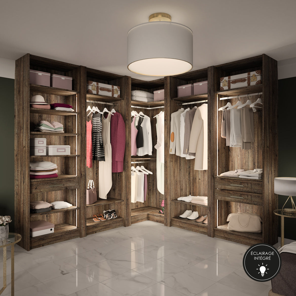 Avec Kazed, composez facilement votre dressing ouvert d'angle en U ou en L au mm près. La mise à dimensions est offerte !