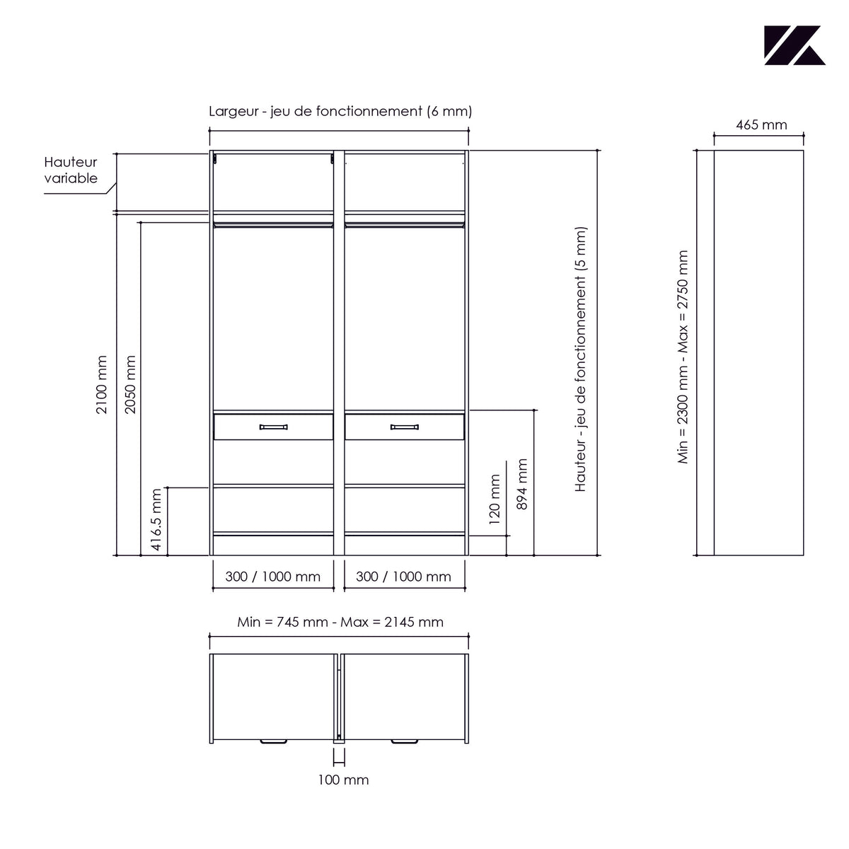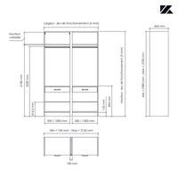 Les points forts : Fabriqué à vos dimensions. Epaisseur de la structure 22 mm, fond de 8 mm monté en rainure pour une rigidité parfaite. Des pieds de réglages permettent le bon ajustement de votre dressing. Konsilio est parfaitement adapté à une installation avec ou sans portes de placard Kazed.