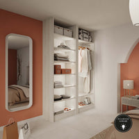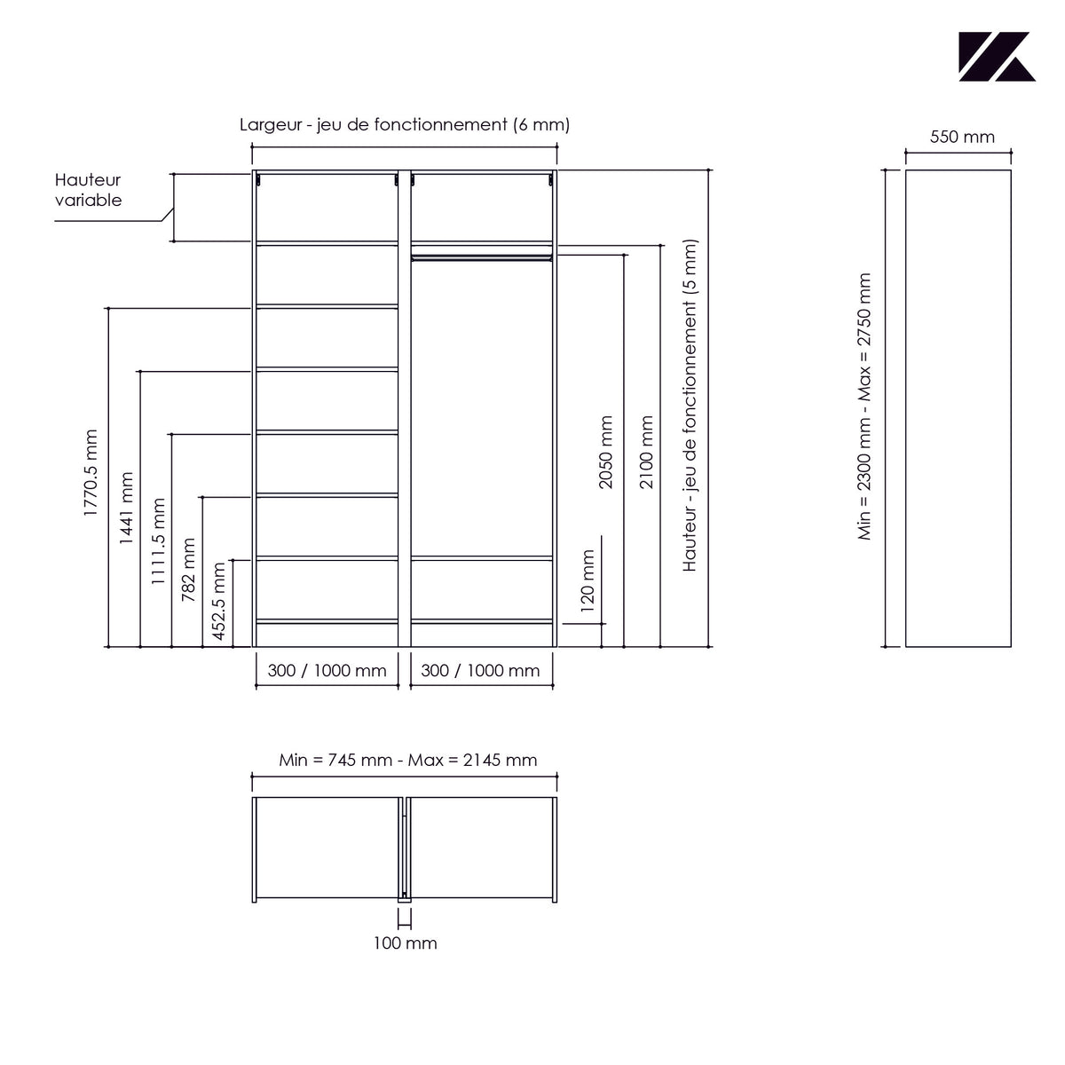 Les points forts : Fabriqué à vos dimensions. Epaisseur de la structure 22 mm, fond de 8 mm monté en rainure pour une rigidité parfaite. Des pieds de réglages permettent le bon ajustement de votre dressing. Konsilio est parfaitement adapté à une installation avec ou sans portes de placard Kazed.