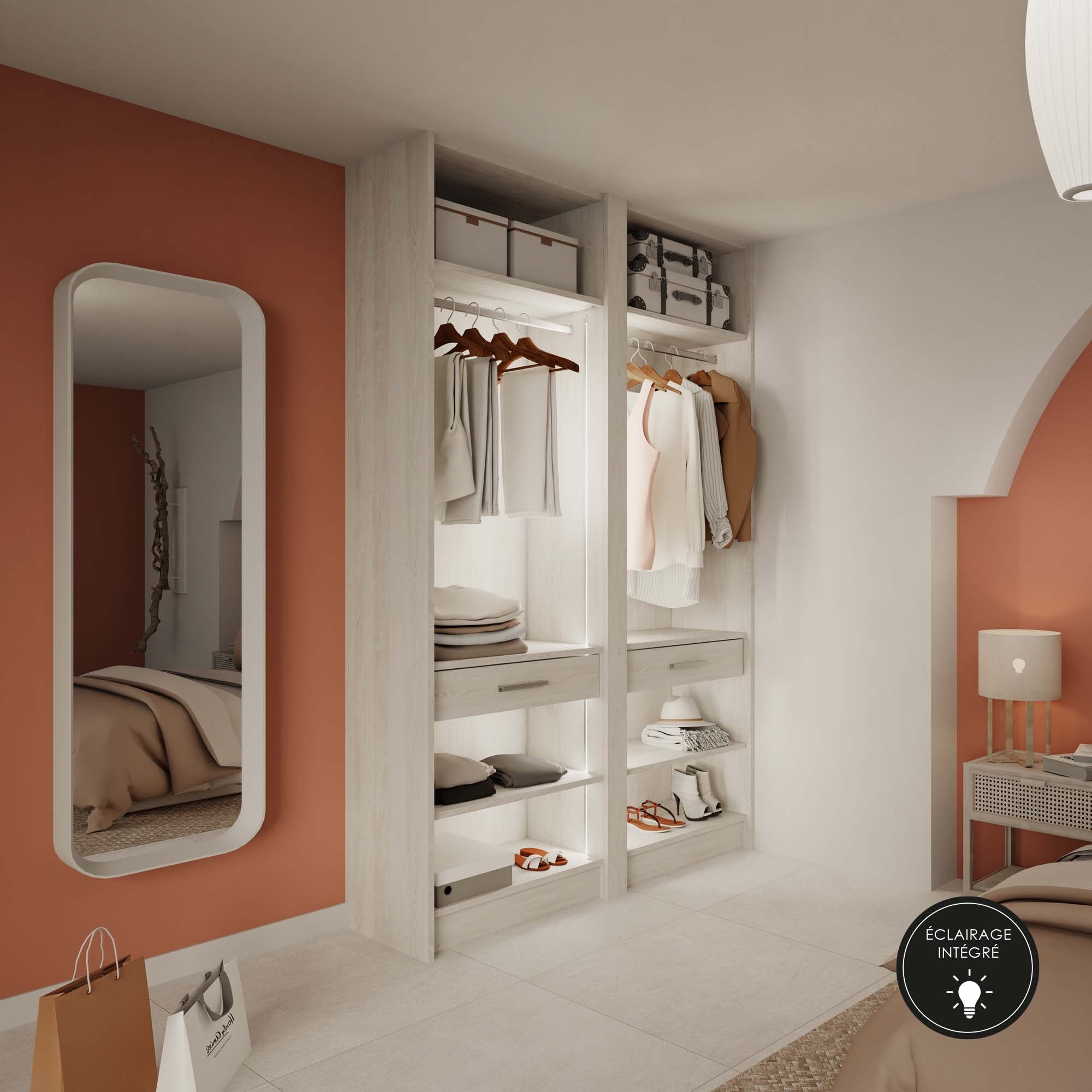 Personnalisable à vos mesures, le dressing Soleo présente l’immense avantage d’être éclairé. Une lumière chaude et agréable éclaire parfaitement le contenu de votre rangement sans vous éblouir.