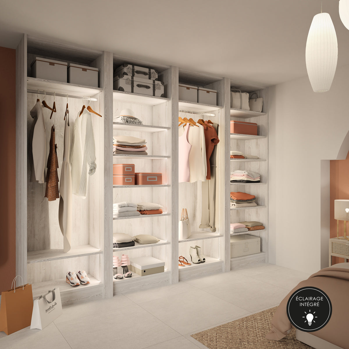 Personnalisable à vos mesures, le dressing Soleo présente l’immense avantage d’être éclairé. Une lumière chaude et agréable éclaire parfaitement le contenu de votre rangement sans vous éblouir.